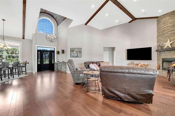 At the center of this magnificent property lies a beautifully crafted 4-bedroom, 3.5-bath home, thoughtfully surrounded by exquisite landscaping. Inside, the open, split-bedroom design is enhanced by soaring cathedral ceilings, creating a refreshing and spacious ambiance. Expansive windows invite natural light into every corner while offering spectacular views of the surrounding landscape.