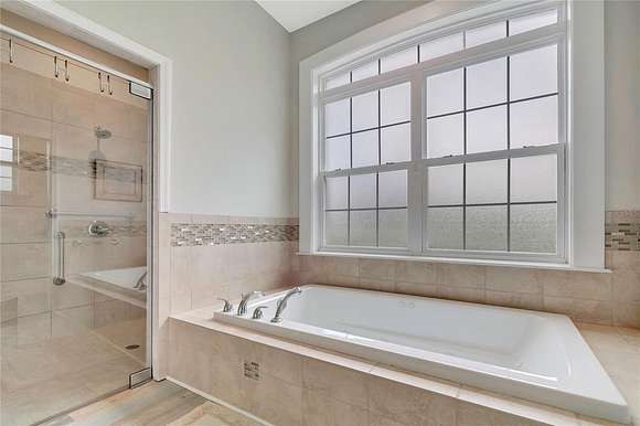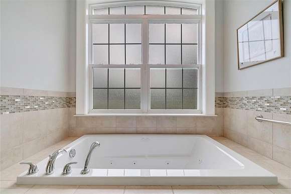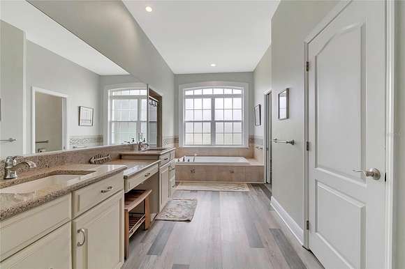 Indulge in the owner's suite, a haven for tranquility, featuring two spacious walk-in closets with custom shelving and an en-suite luxurious bathroom complete with dual vanities, a walk-in shower, and a garden tub for ultimate relaxation.