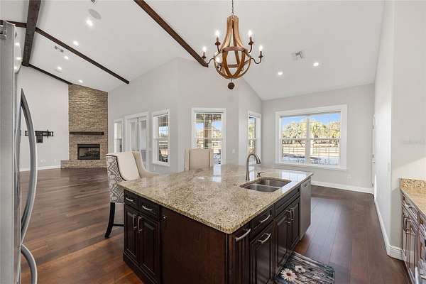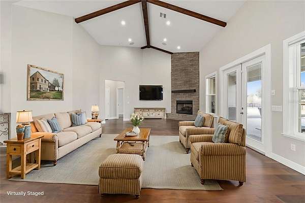 Inside the 4-bedroom, 3.5-bath home (2,804 SF), soaring cathedral ceilings, exposed wood beams, hardwood floors, and a dramatic floor-to-ceiling stacked stone gas fireplace anchor the open split-bedroom floor plan. Expansive windows flood the home with natural light and frame sweeping views of your countryside.