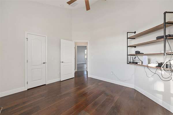 - Cathedral Ceiling(s), Ceiling Fans(s), Eat-In Kitchen, High Ceilings, Kitchen/Family Room Combo, Open Floorplan, Primary Bedroom Main Floor, Solid Surface Counters, Solid Wood Cabinets, Walk-In Closet(s), Window Treatments