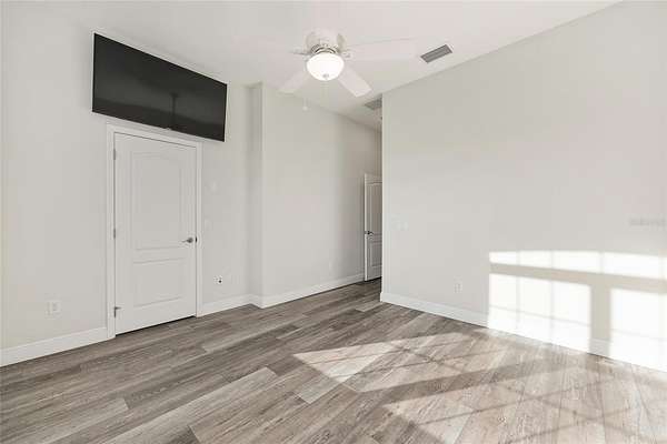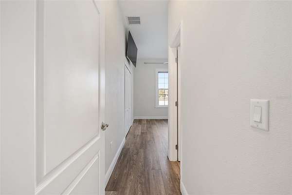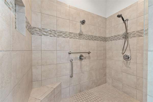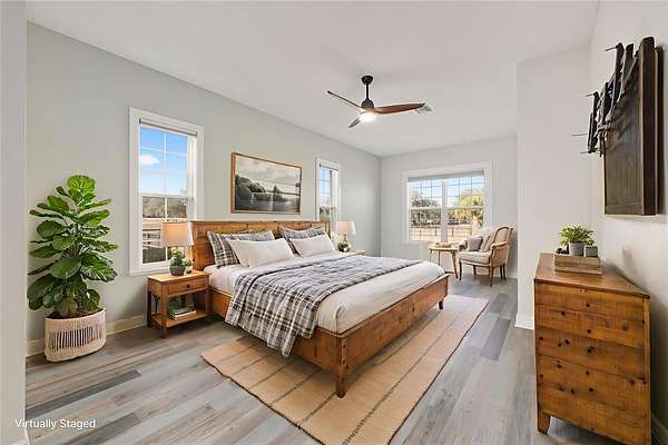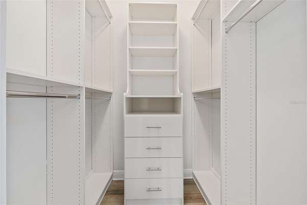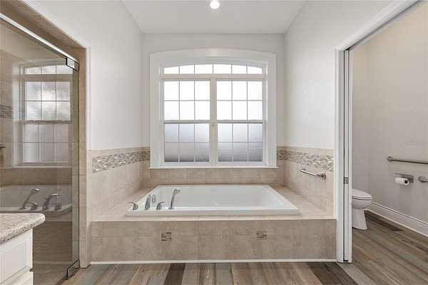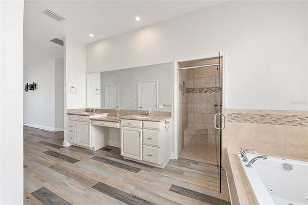 The primary suite is a private retreat with two large walk-in closets and a spa-inspired bath offering dual vanities, walk-in shower, and soaking garden tub.