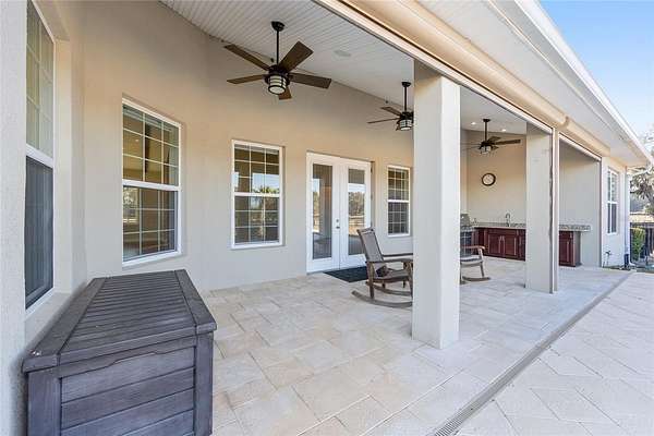 Outdoor living shines with a covered lanai complete with summer kitchen and built-in fire pit -- perfect for gatherings after a day of riding. The heated saltwater pool and spa with waterfall and self-cleaning system (installed 2024) create a true resort-style setting overlooking the farm.