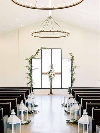 The third largest building measures approximately 3,220 square feet. It has a main room with arched windows, canned lighting, chandeliers, and a polished concrete floor. There are two rooms that could serve as potential bedrooms, each with a restroom. There is also a powder room located in the vestibule. This building is currently used as a sanctuary.