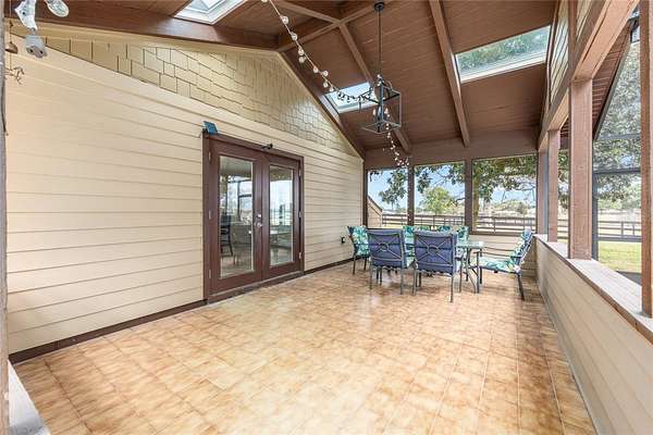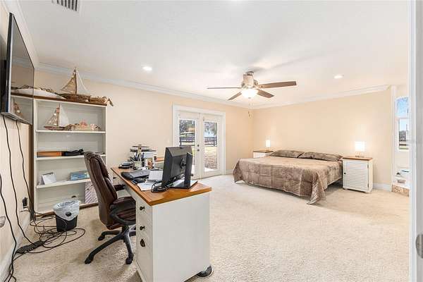 The open-concept living and dining area invites you to relax and entertain with ease, boasting a large wood-burning fireplace that adds both charm and warmth to the space. Natural light floods the generous primary suite, creating a tranquil retreat. The luxurious ensuite bath is a sanctuary in itself, with exquisite granite countertops, travertine tiling, a deep soaking tub, a walk-in shower, and even a sauna--perfect for ultimate relaxation. Each guest bedroom is generously sized, providing ample space for rest and storage. French doors off the kitchen open to an inviting lanai, ideal for alfresco dining or enjoying the natural beauty of your surroundings. The screened-in pool area offers an expansive and private oasis, perfect for unwinding or hosting summer gatherings. A spacious two-car garage provides ample room for vehicles, equipment, and extra storage. This property also caters to the needs of your livestock with its fully fenced and cross-fenced land. The three paddocks are ready for your horses or other animals, while the charming 3-stall barn features both front and rear access for easy movement of animals. Additionally, the barn includes a large feedroom and tackroom for all your equestrian essentials.The Meadow Lands community is renowned for its wide easements and scenic trails, ideal for leisurely rides and connecting with fellow equestrian enthusiasts. This highly coveted area is just minutes from the vibrant city of Ocala and conveniently located off 441/301, providing easy access to Gainesville and beyond.