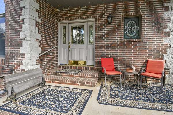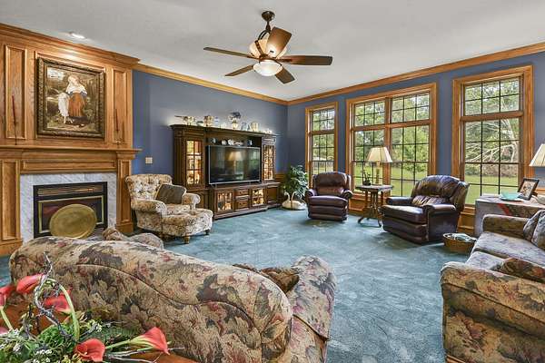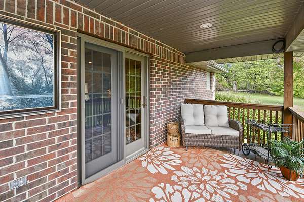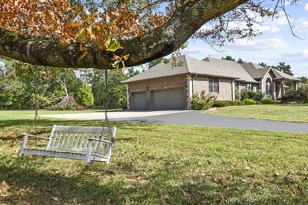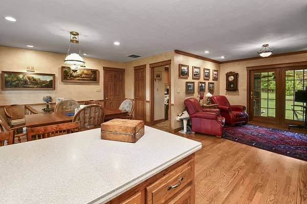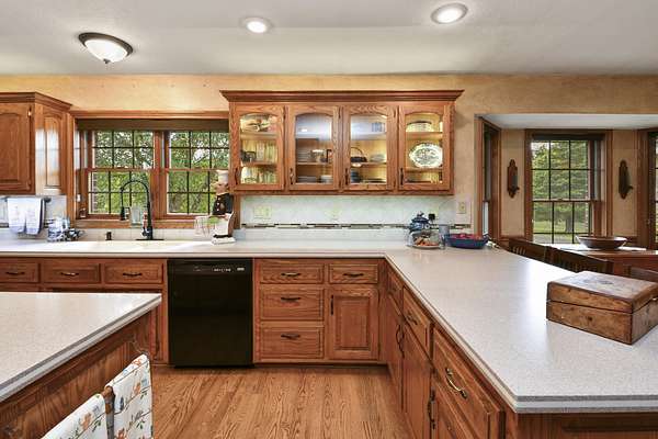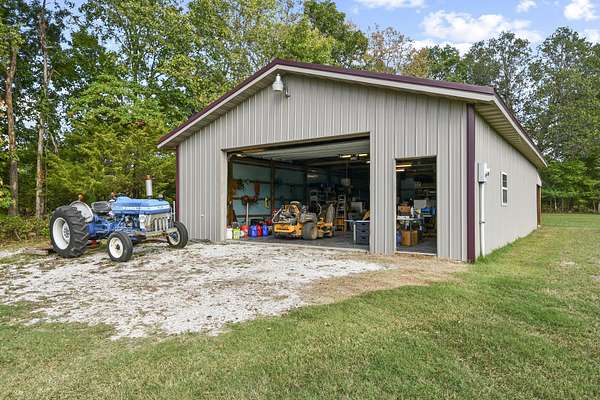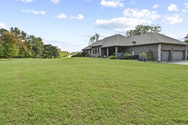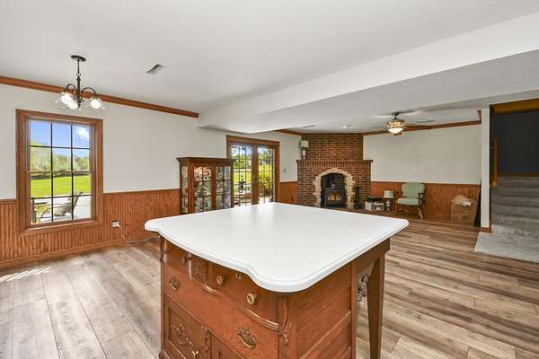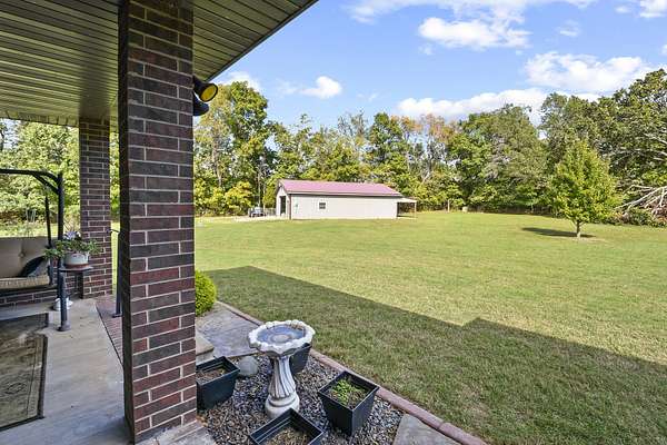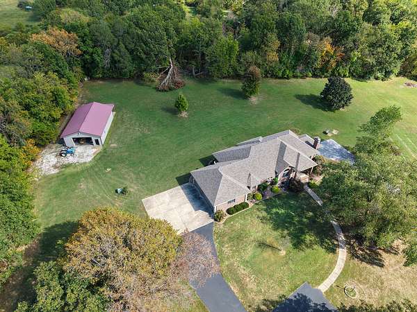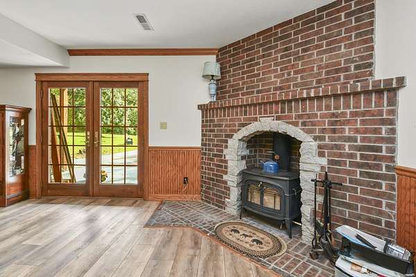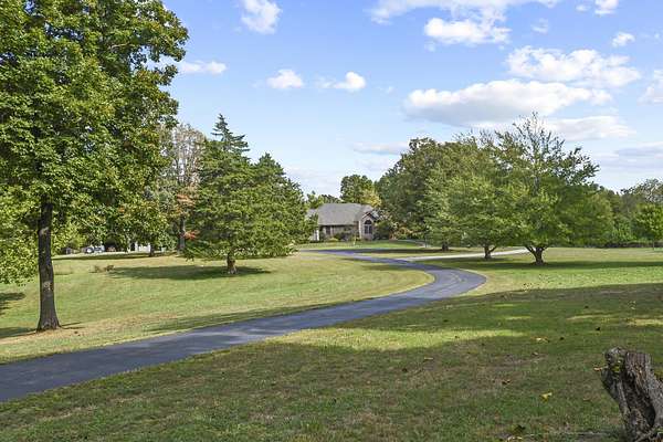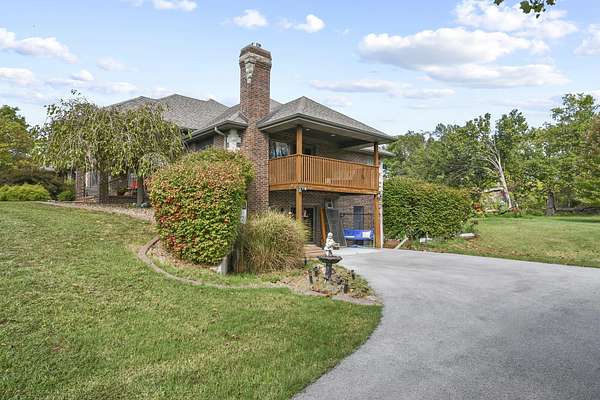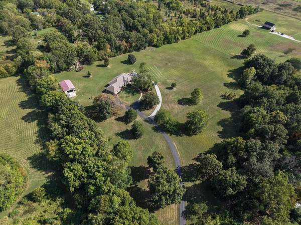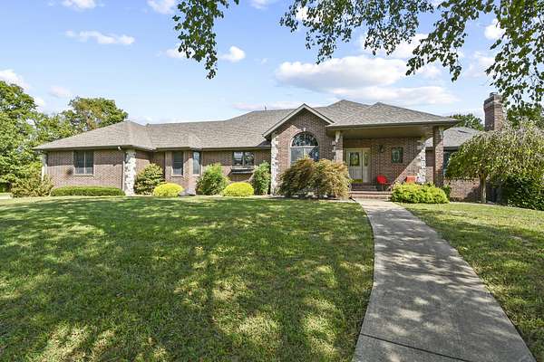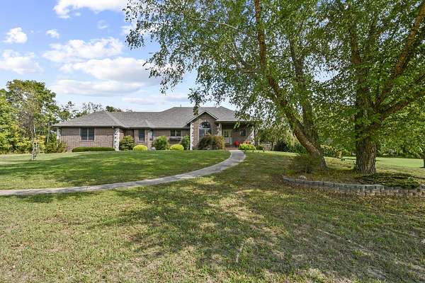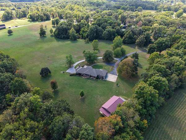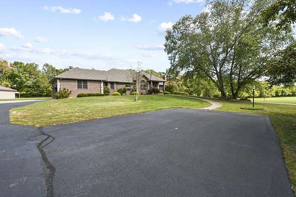 Find your next home in this lovely secluded all brick house on ten acres just minutes from town. Drive into a parklike setting of majestic trees, open fields, privacy and quiet. The kitchen is a lighthouse of warmth with a wealth of convenient roll out shelves and plenty of counter top on island and over bar area. The large Living Room has beautiful crafted ash wainscoting, crown molding, wall to wall windows with a see through gas fireplace to the hearth Room. From there doors open to a large covered porch. The primary bath and bedroom has French Doors to a covered deck with a panaromic view of the propery. The first floor also has another full bath and bedroom. Leaving the wood covered floor of the dining room and foyer, go downstairs to a great room with wood burning stove in fireplace, kitchen with double sink, dishwasher, stove, fridge and ample dining area. There are three more large bedrooms and tons of closets and a full bathroom plus an extra large room for play, crafts, storage, etc. All is easily accessed by a driveway to the large patio and walk-out doors. Not only does the house have a three car attached garage but a 30x40' concrete floor building. Add your loved ones to call it
