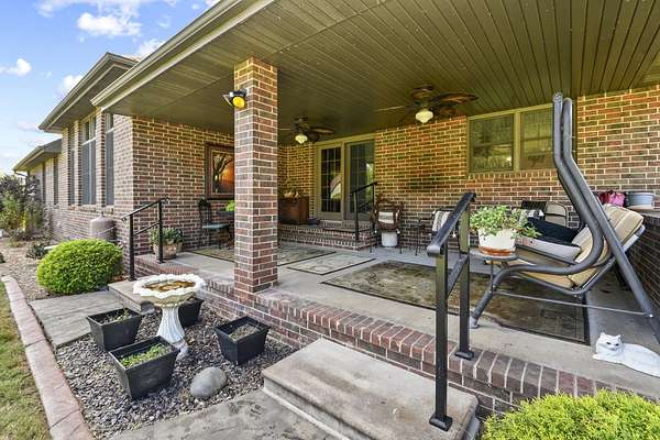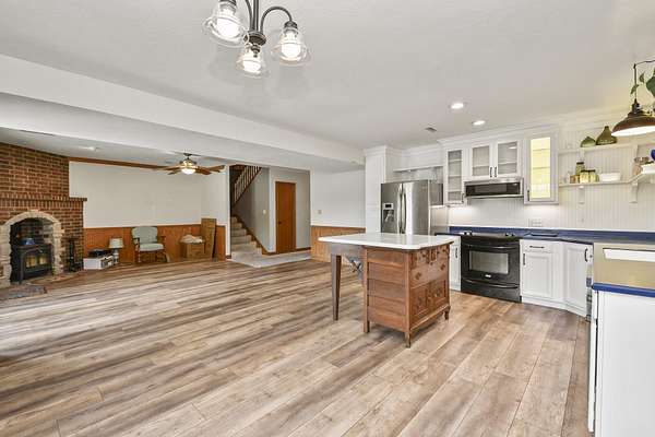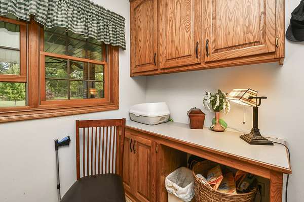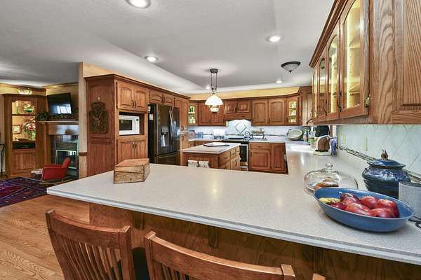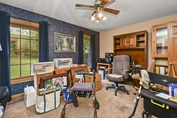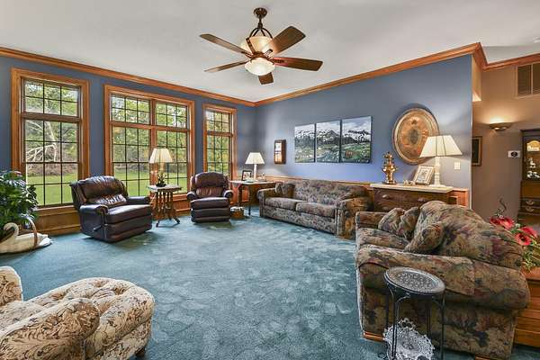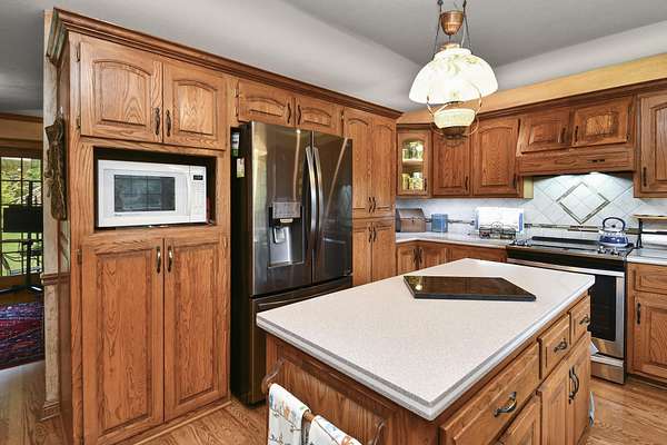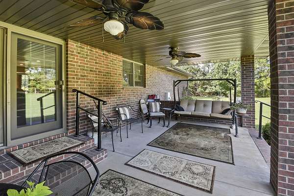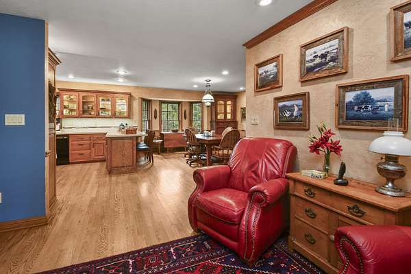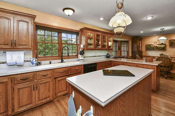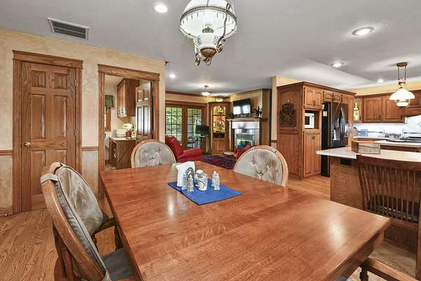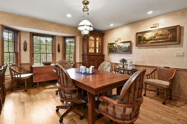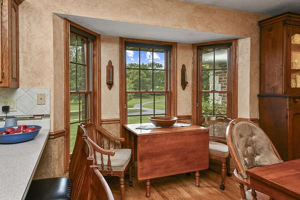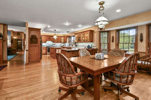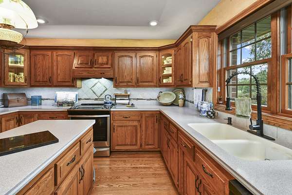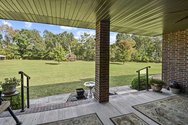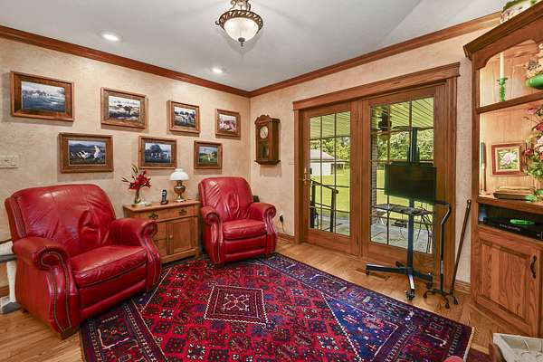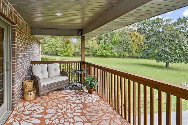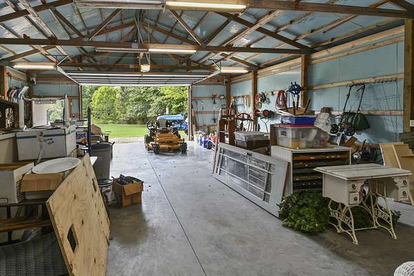 Find your next home in this lovely secluded all brick house on ten acres just minutes from town. Drive into a parklike setting of majestic trees, open fields, privacy and quiet. The kitchen is a lighthouse of warmth with a wealth of convenient roll out shelves and plenty of counter top on island and over bar area. The large Living Room has beautiful crafted ash wainscoting, crown molding, wall to wall windows with a see through gas fireplace to the hearth Room. From there doors open to a large covered porch. The primary bath and bedroom has French Doors to a covered deck with a panaromic view of the propery. The first floor also has another full bath and bedroom. Leaving the wood covered floor of the dining room and foyer, go downstairs to a great room with wood burning stove in fireplace, kitchen with double sink, dishwasher, stove, fridge and ample dining area. There are three more large bedrooms and tons of closets and a full bathroom plus an extra large room for play, crafts, storage, etc. All is easily accessed by a driveway to the large patio and walk-out doors. Not only does the house have a three car attached garage but a 30x40' concrete floor building. Add your loved ones to call it