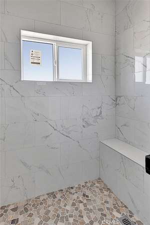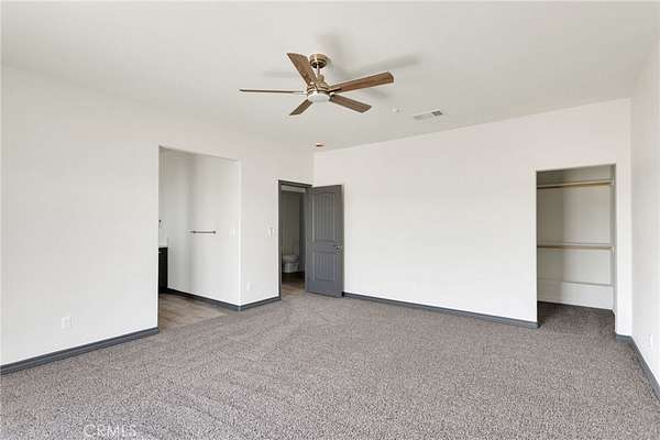 The primary suite includes a spa-inspired bathroom with a custom tile shower and a walk-in closet with built-in shelving and a dedicated shoe rack. Energy-efficient upgrades include dual-pane windows and sliders, a 5-ton HVAC system, solar panels, full Title 24 compliance, and radiant barrier roof insulation.