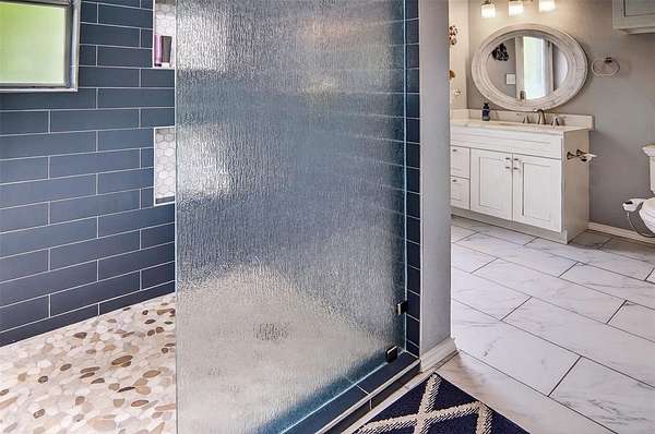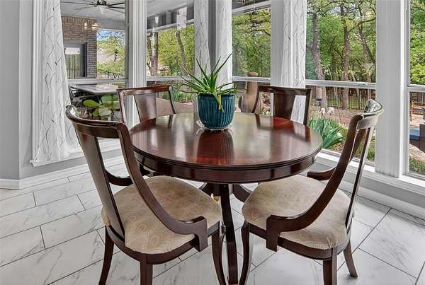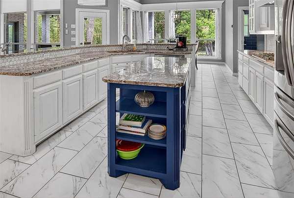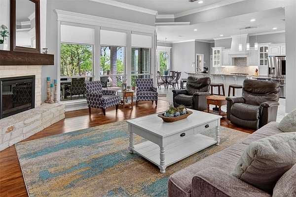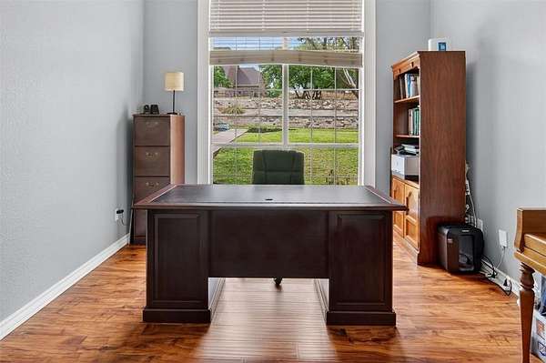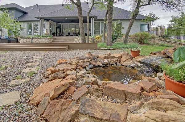 Welcome to this beautiful custom home on 1.6 acres in the lovely neighborhood of Forest Park. The open floor plan with soaring ceilings and a wall of windows overlooking a beautiful backyard welcomes you. Walk out onto the large covered patio and into the beautifully-landscaped backyard where you can relax to the sights and sounds of nature. A lovely rock water feature with a nearby deck and swimming pool with cabana and outdoor kitchen make for fun, relaxing days and evenings. The open kitchen area with granite counters, tile backsplash, large island, gas cooktop, double ovens, and walk-in pantry is perfect for entertaining. The handsome wood-burning, rock fireplace in the family room has a gas starter and can be converted to gas only with gas logs for convenience. The large primary suite includes an ensuite bath with free-standing tub, over-sized shower, dual sinks, and a walk-in closet with built-in chests. Three other bedrooms, 3 more full baths, a second dining area, an office, and a game room (which could be a 5th bedroom) complete the living space. The oversized 3-car garage contains a workbench and cabinets. A storm shelter and whole-home, natural gas generator on city gas (up to 3 days of power) provide safety and security during times of severe weather.