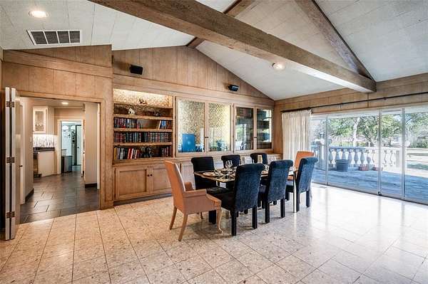 Imported lava rock from Hawaii--personally selected by the original owners--anchors the dramatic fireplace and graces portions of the formal living & dining rooms, creating a warmth and texture. Vaulted ceilings with exposed truss beams stretch across the family & breakfast rooms, while walls of windows, patio doors, & custom built-ins fill the home with light, depth, & character.