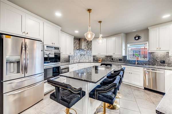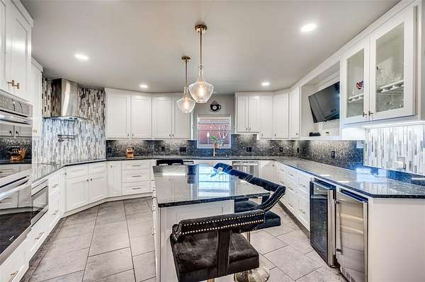 The recently renovated chef's kitchen blends modern luxury with the home's historic soul--featuring double ovens, pot filler, wine refrigerator, granite surfaces, custom cabinetry, & striking designer lighting.