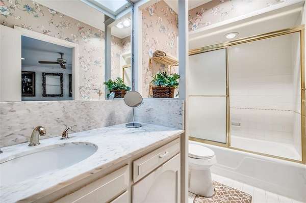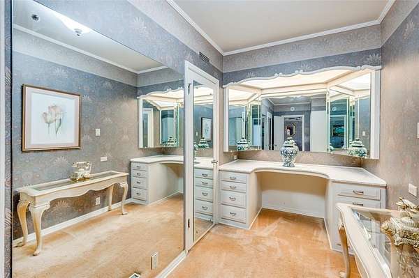 An electric-gated drive leads to the three-car garage. Mature trees canopy the grounds. Meticulously maintained landscaping surrounds an exquisite pool framed by architectural stonework. The setting feels like a private retreat.
