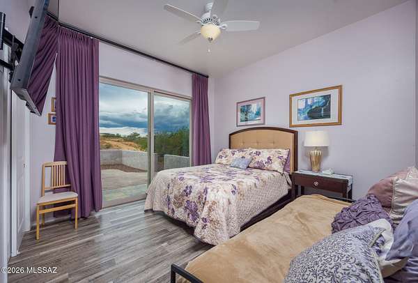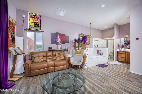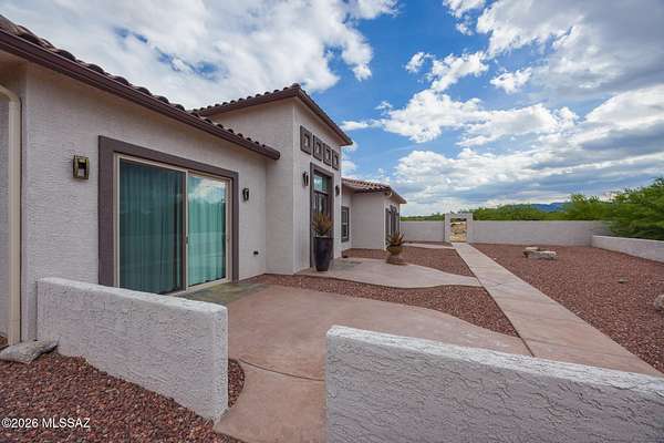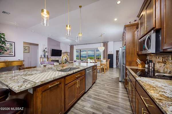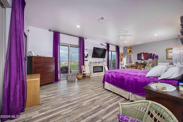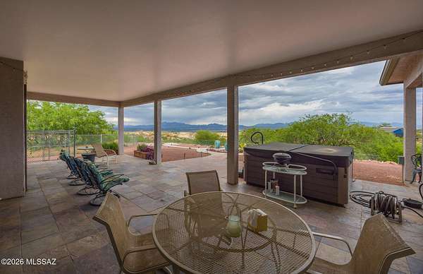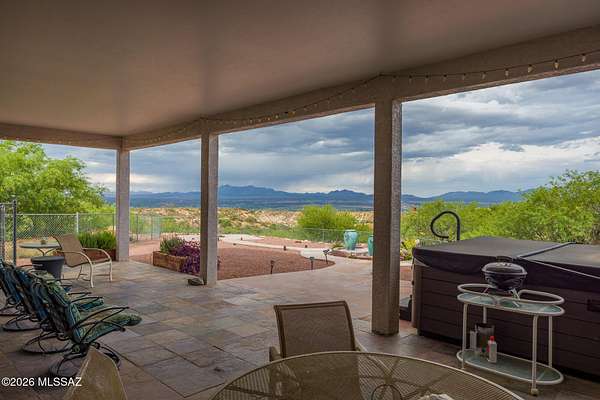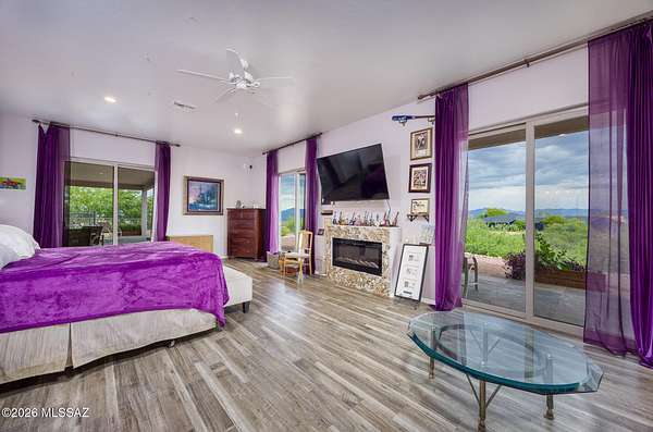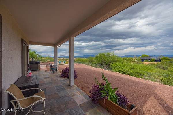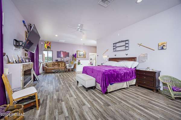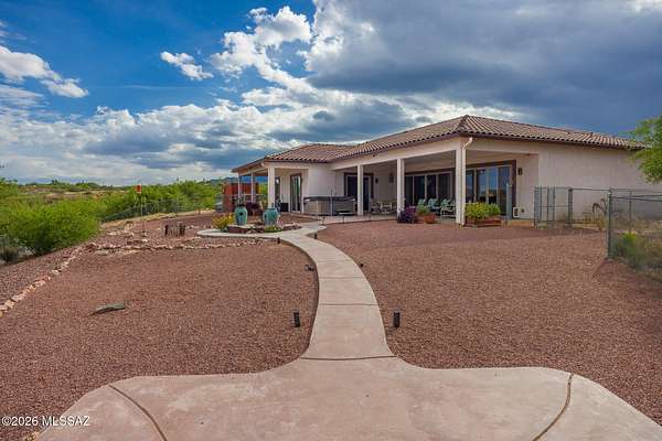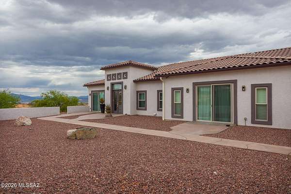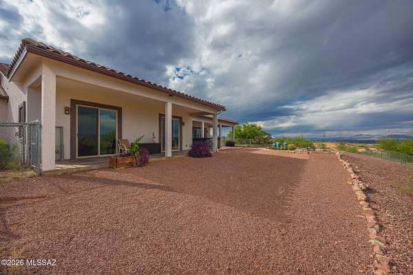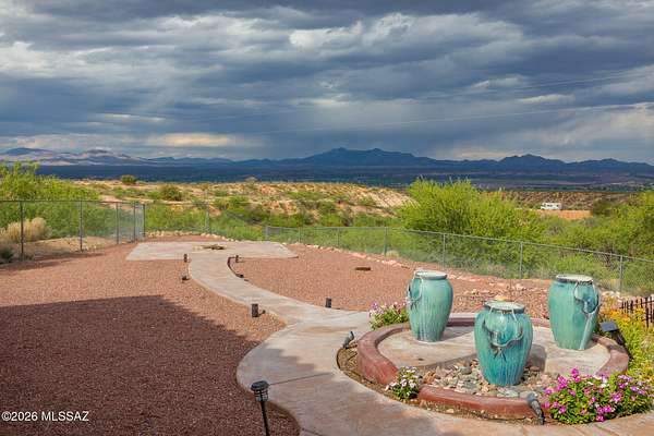 Experience luxury desert living on this expansive 4.01-acre estate. This meticulously designed 4-bedroom, 4-bathroom home features two primary suites with private en-suites: one is fully handicap accessible with a convenient wet bar, while the second offers a cozy fireplace retreat. Every bedroom is flooded with natural light through large sliding glass doors that seamlessly blend indoor and outdoor living. The heart of the home is a true chef's kitchen, boasting elegant granite countertops, high-end LVT flooring, and a functional layout perfect for entertaining. Step outside to a private oasis featuring a relaxing spa, a tranquil fountain, and two dedicated dog runs, all set against the breathtaking backdrop of the Benson landscape.