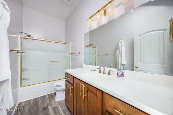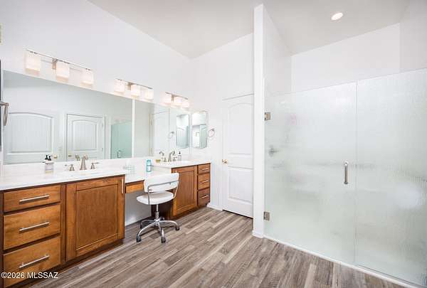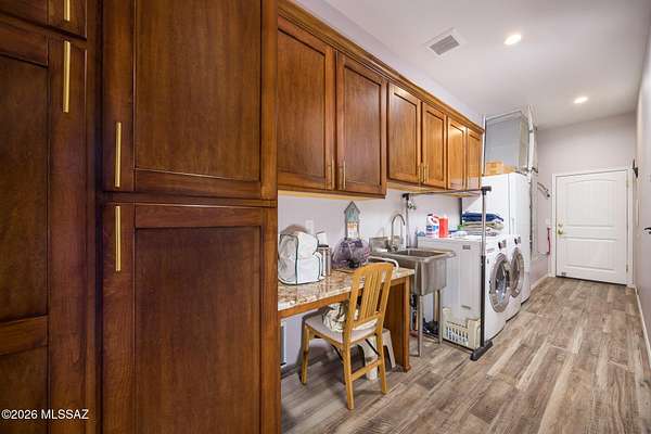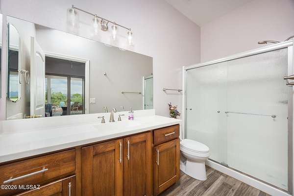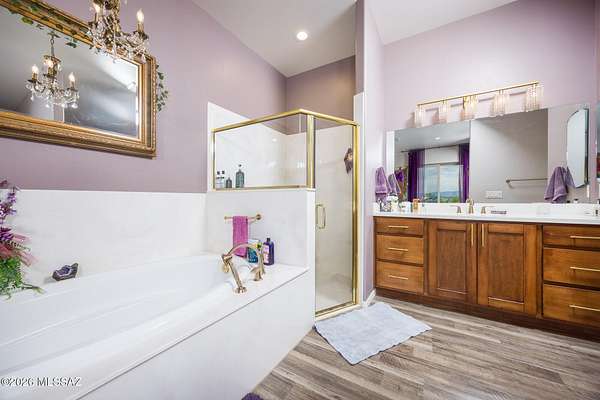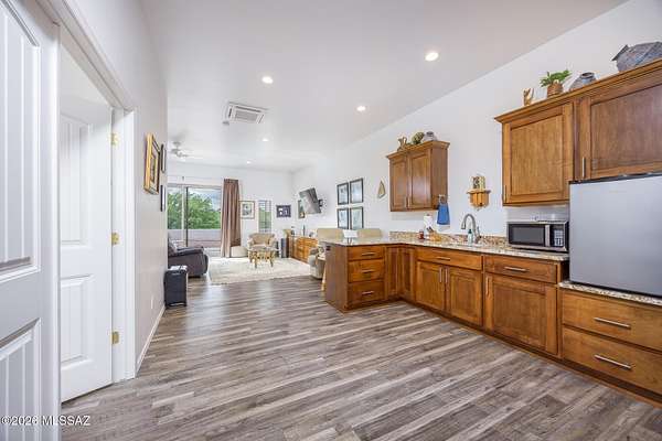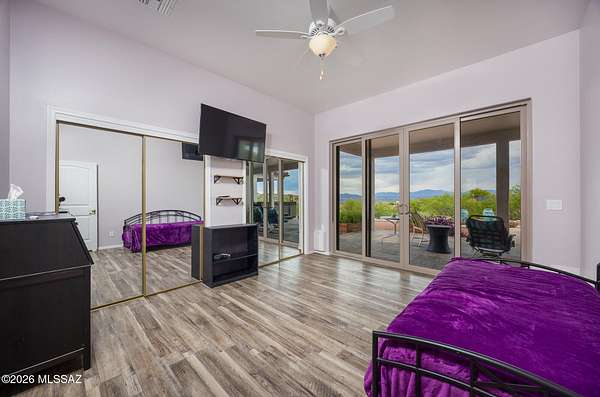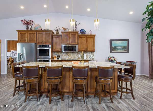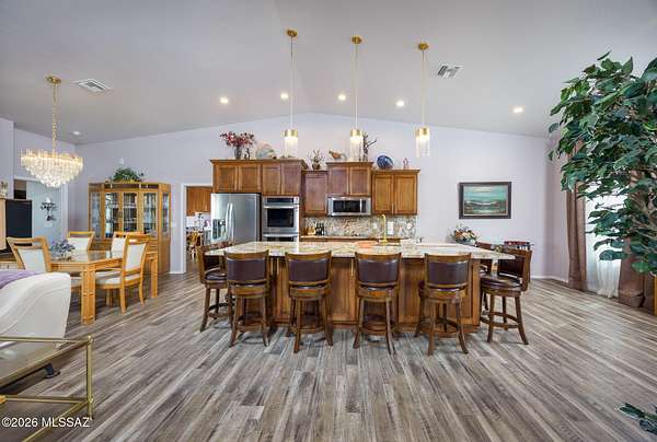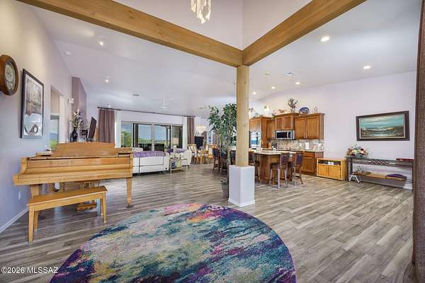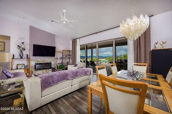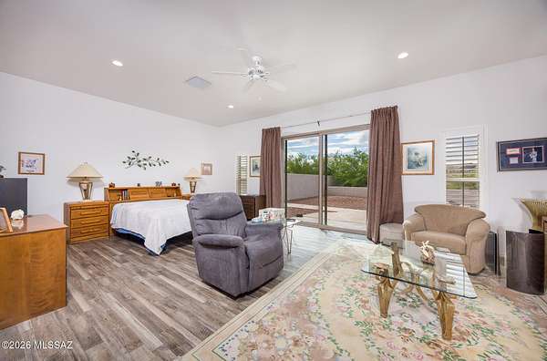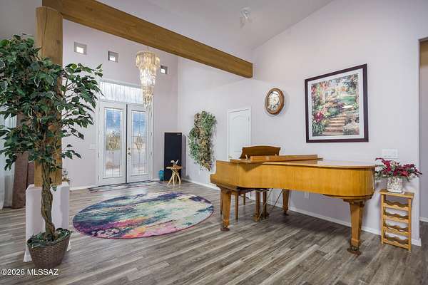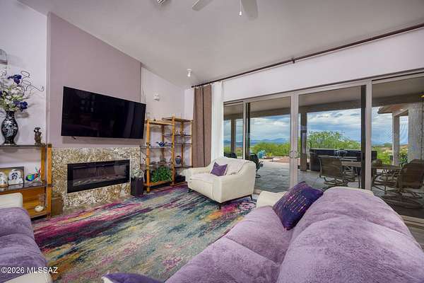 Experience luxury desert living on this expansive 4.01-acre estate. This meticulously designed 4-bedroom, 4-bathroom home features two primary suites with private en-suites: one is fully handicap accessible with a convenient wet bar, while the second offers a cozy fireplace retreat. Every bedroom is flooded with natural light through large sliding glass doors that seamlessly blend indoor and outdoor living. The heart of the home is a true chef's kitchen, boasting elegant granite countertops, high-end LVT flooring, and a functional layout perfect for entertaining. Step outside to a private oasis featuring a relaxing spa, a tranquil fountain, and two dedicated dog runs, all set against the breathtaking backdrop of the Benson landscape.