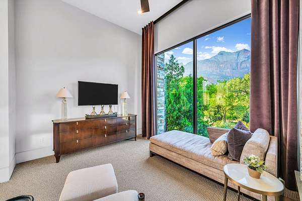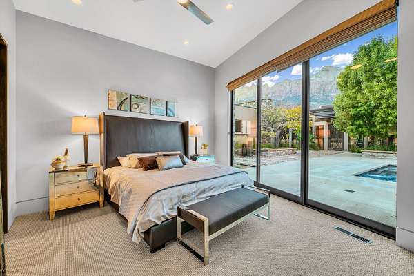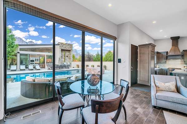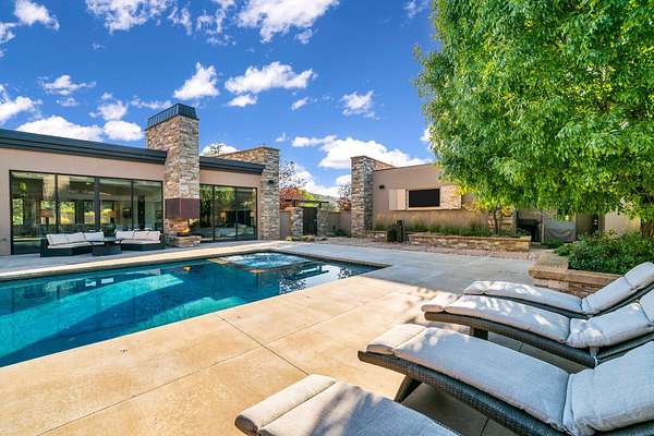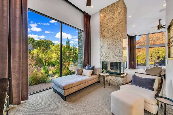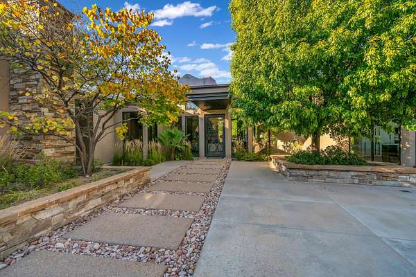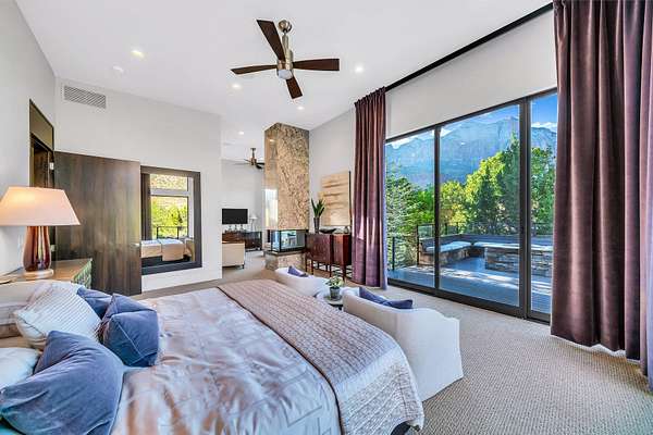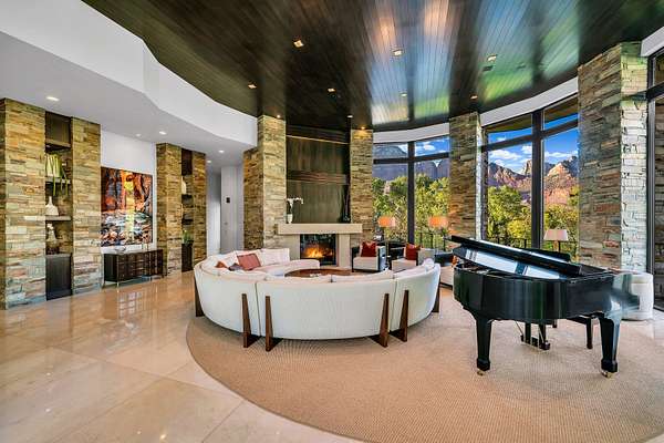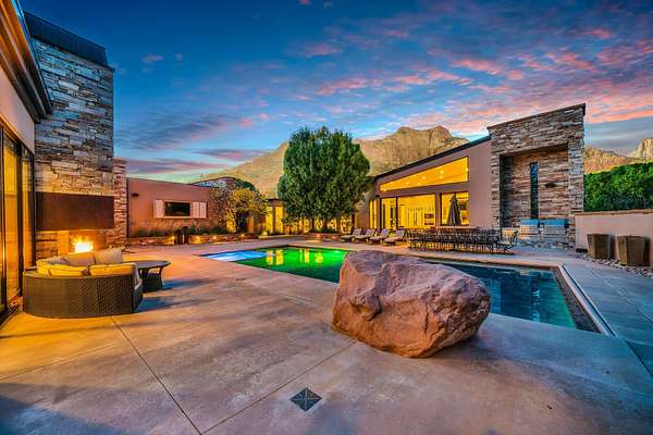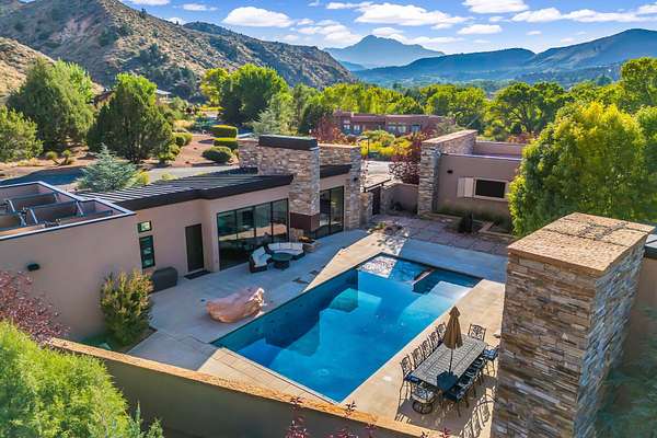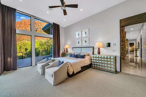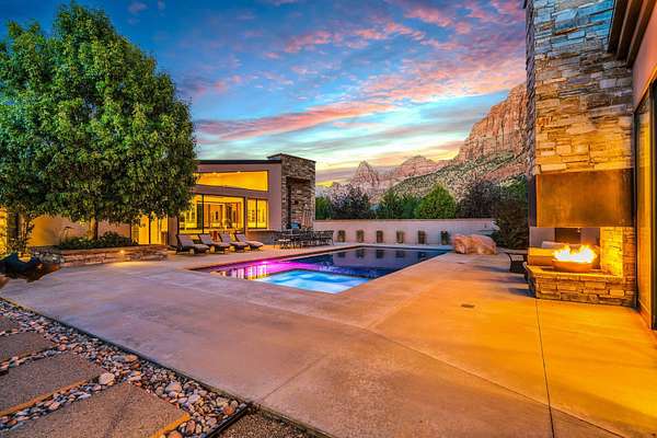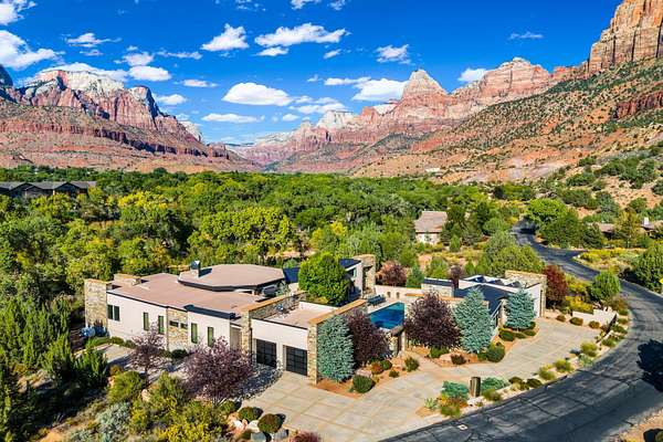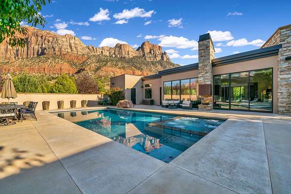 Ultimate Gathering Place at Zion!! Spectacular showcase home on two lots along the river in Springdale!! Tastefully designed and professionally decorated, this gracious large home combines extensive stonework, floor to ceiling sliding glass doors, marble floors and dark woodwork to surround you in casual elegance with Zion's peaks looming on all sides. Created for sizable family or groups, the home and casita are separated by an expansive patio with swimming pool and spa complete with colored lights and fountains, fire pit and outdoor kitchen for entertaining or just enjoying the stunning red rock views while you relax around the pool, in total privacy. Four fireplaces, two outdoor fire pits, theater room, yoga room, 7 ensuite bedrooms including two bunk rooms so you can sleep up to 24. This is perfect for a family gathering place or corporate retreat just one mile from Zion National Park, within walking distance to world class restaurants and shopping. All furniture and furnishings were custom made for this home and are included in the sale. Excludes piano and some of the personal art works.