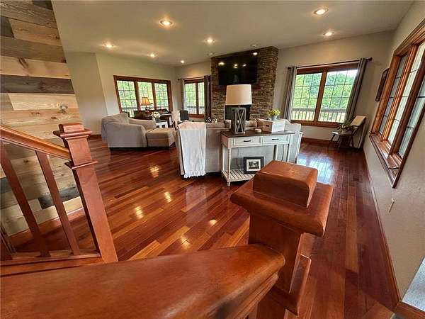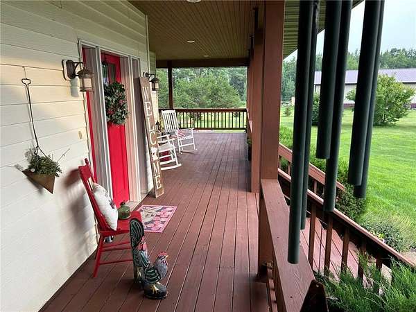 Very Unique Harlan Lake property on 5 acres with Guest Home. Main Home features 5 bedrooms, 4 baths, almost 5000 square feet, A Huge Wrap Around Porch, Main floor Primary ensuite, custom kitchen, Gas Fireplace, Hardwood floors, MF Laundry, Upper and Lower level Family Rooms, Plenty of storage, Inground lake fed sprinkler system, Large Mudroom, and a 2 car attached garage and 28x40 detached garage w/670 sq ft Guest home (currenty rented) includes 2 bedroooms and 1 bath. The property incudes privacy but only minutes from Pillager/Baxter and all the Brainerd Lakes area Amenities. This is a one of a kind property!