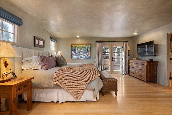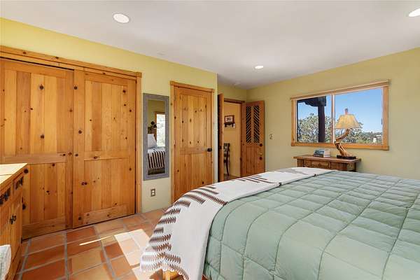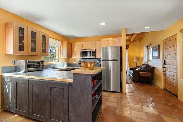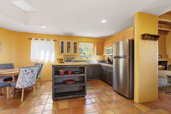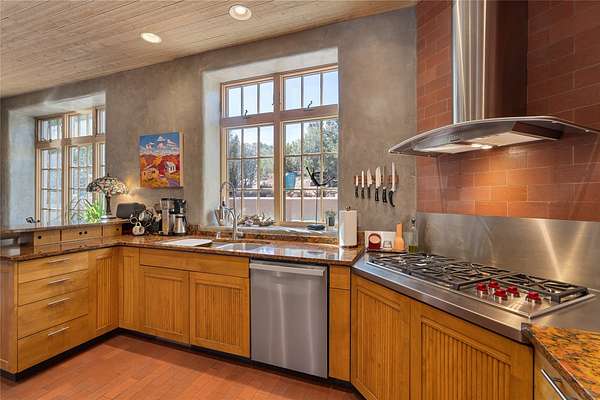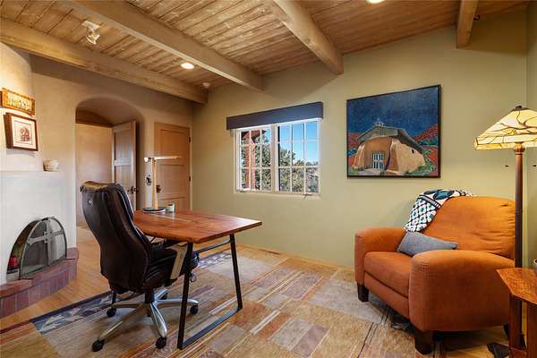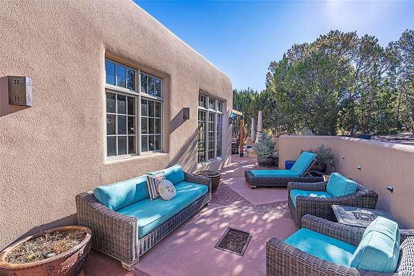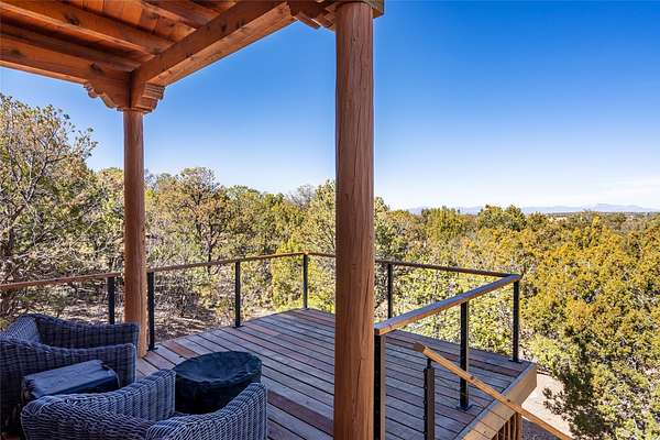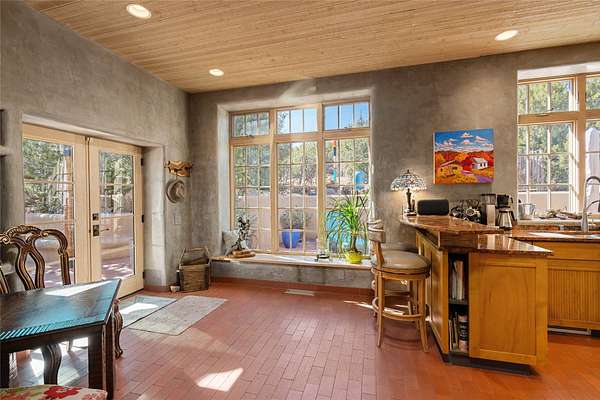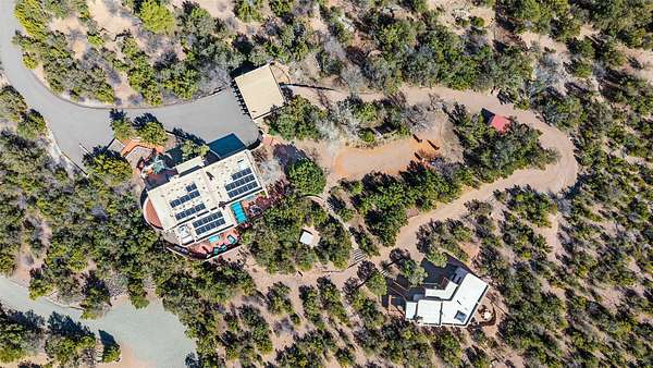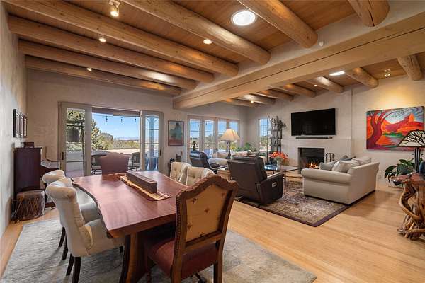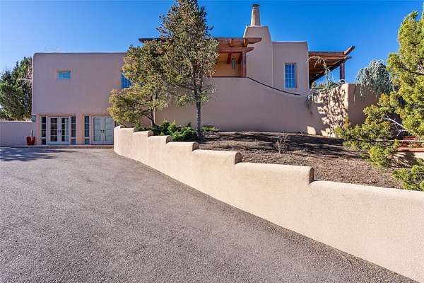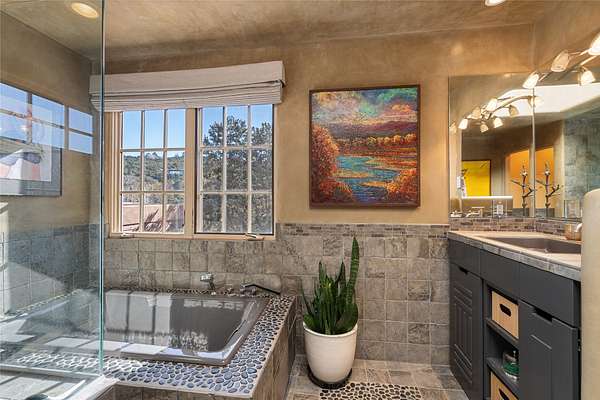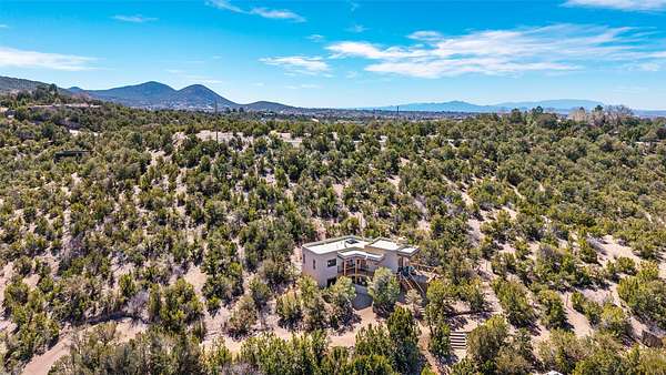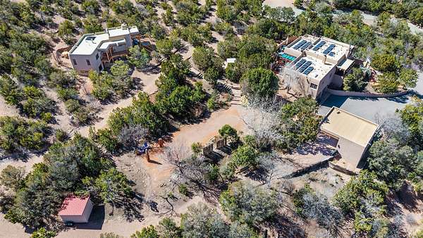Set in the hills above Santa Fe with spectacular views of the Jemez Mountains, this distinctive 2.5-acre compound pairs privacy with proximity-just minutes from Canyon Road and the Plaza. The property includes a main residence and a separate guest casita, offering flexibility for visitors, creative space, or extended stays. The main home features high ceilings, arched doorways, vigas, bamboo floors, and diamond plaster walls. The open living and dining spaces face the Jemez Mountains through a wall of windows, with double French doors opening to a portal and patio positioned for sunset views. The kitchen is equipped with stainless Wolf and Sub-Zero appliances, granite countertops, a generous walk-in pantry, and a dining nook that opens through French doors to a patio perfect for morning coffee or an evening cookout with friends. The owner's suite sits down a quiet hallway and includes a spacious closet with custom shelving and a luxurious bath with bespoke stone and tile floors. A study completes the upper level, while the lower level offers a guest suite with ensuite bathroom that also works well as a studio or home office. Set apart at the rear of the 2.6 acre property, the guest casita has its own driveway access. The upper level includes a living area opening to a view deck, along with a bedroom, bath, and fully equipped kitchen with dining area. Below is a private second guest suite with bath, adaptable as a studio or workspace. A fully owned 8.3kW solar array provides the majority of the main home's electricity.