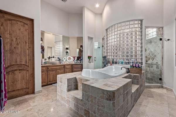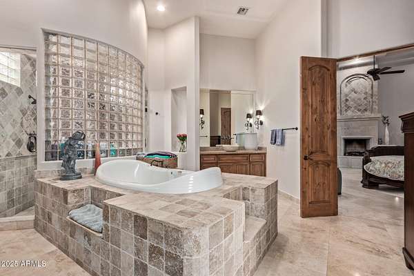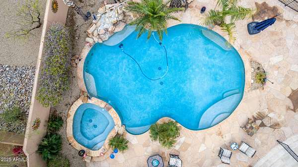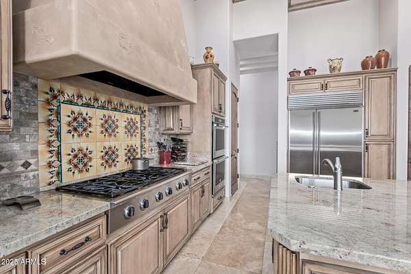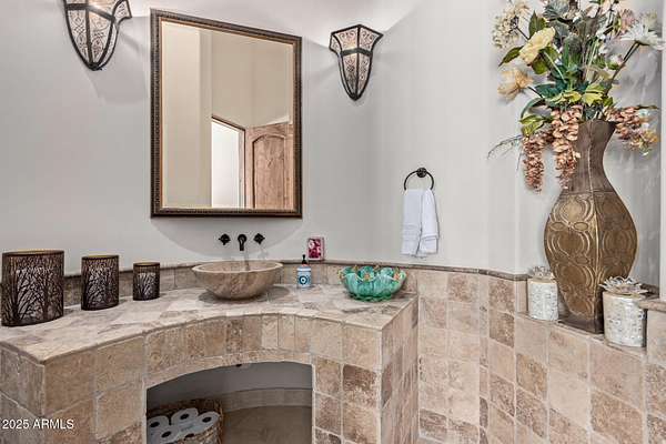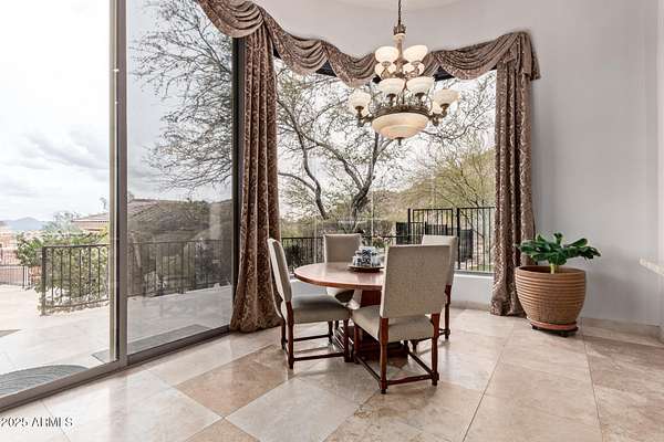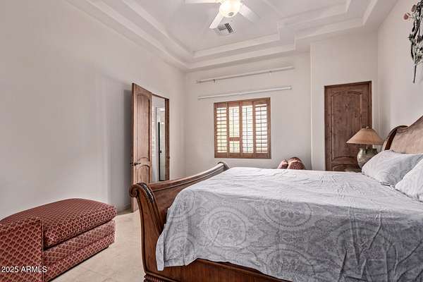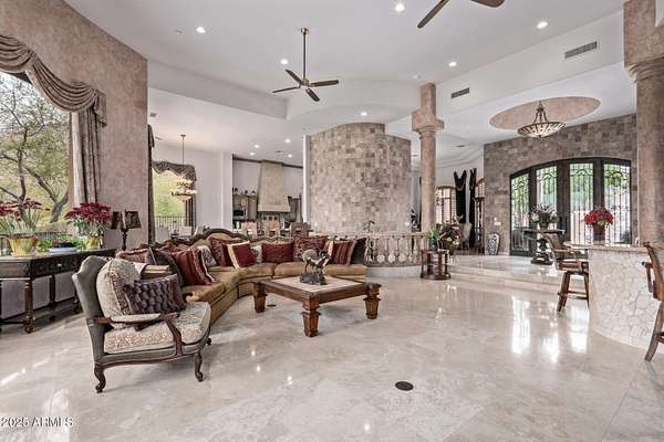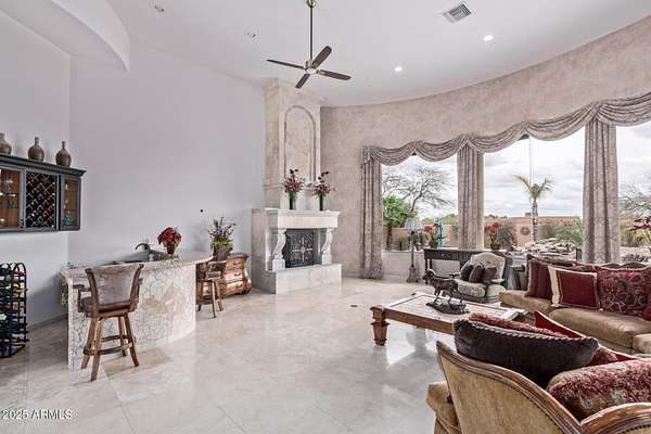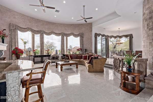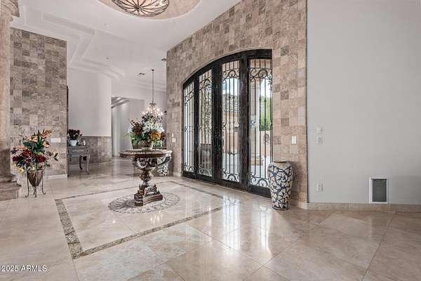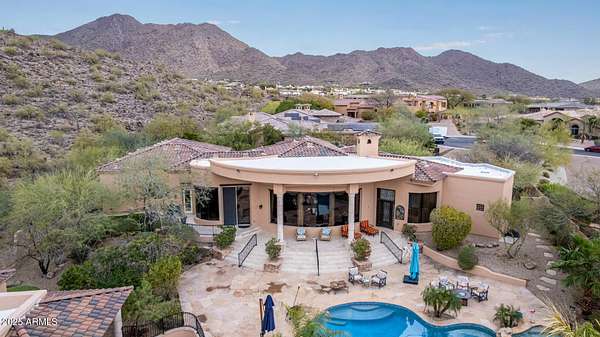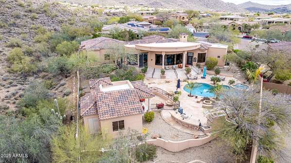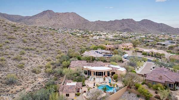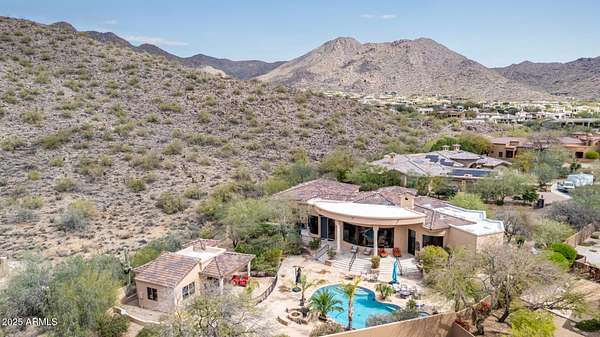 Nestled in the exclusive Rancho Trinidad enclave of North Scottsdale, this stunning 5,841 sq ft estate, built in 2002, redefines luxury across a private 2-acre lot. With 5 bedrooms and 6 bathrooms, this single-family masterpiece offers breathtaking vistas of Scottsdale Mountain, vibrant city lights, and the Sonoran Desert's iconic sunsets. A gated driveway ushers you into a serene courtyard, where a flickering fireplace sets an elegant tone. Inside, 18-foot coffered ceilings soar above meticulously crafted interiors, adorned with custom shutters, electronic sun shades, and bespoke artisan finishes. The gourmet kitchen, a culinary haven, boasts dual pantries, premium stainless appliances, and twin islands, seamlessly connecting to a grand great room warmed by a stately fireplace-perfect for sophisticated gatherings. The palatial primary suite is a private retreat, featuring a cozy fireplace, a spa-inspired ensuite with natural stone accents, and a walk-in closet rivaling high-end boutiques. Three additional en-suite bedrooms, including a fully appointed detached guest house, offer luxurious comfort for family or guests. Outdoors, the sprawling grounds unfold into a desert paradise: a resort-style pool and spa cascade amid terraced gardens, with expansive patios ideal for starlit entertaining. Located in the prestigious 85259 ZIP code, minutes from top-rated BASIS Scottsdale, the scenic McDowell Sonoran Preserve, and the vibrant DC Ranch community, this estate marries tranquility with connectivity. Embrace a lifestyle where every detail exudes timeless luxury and Arizona's natural splendor.