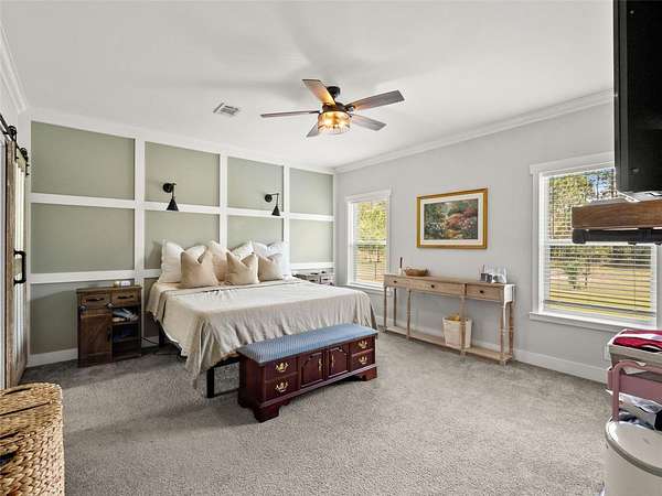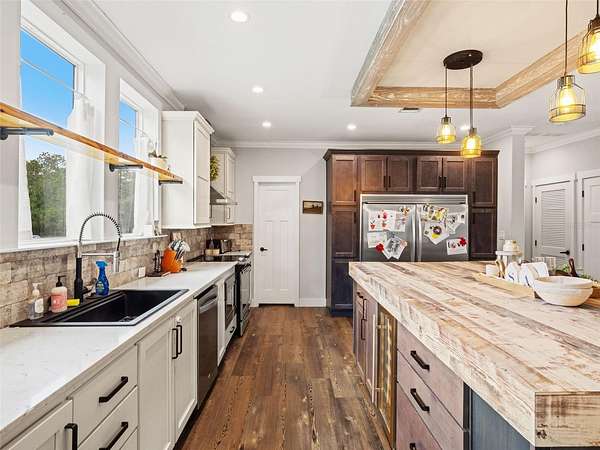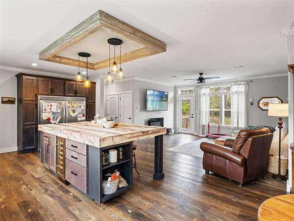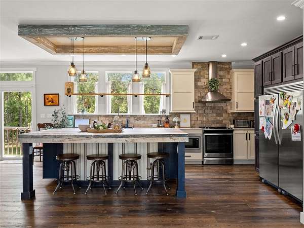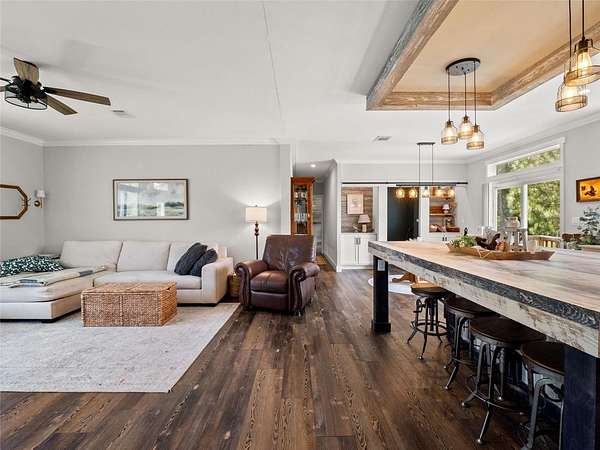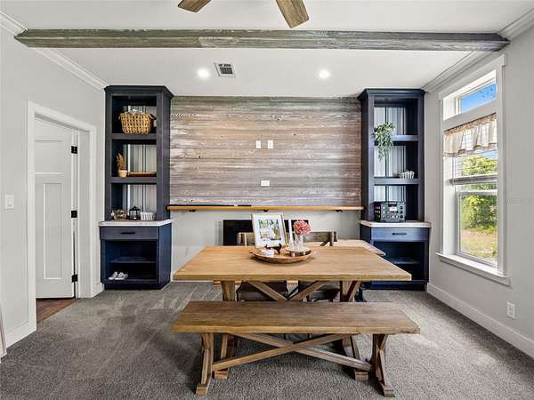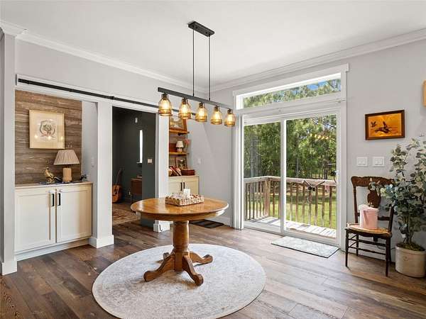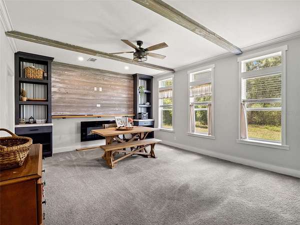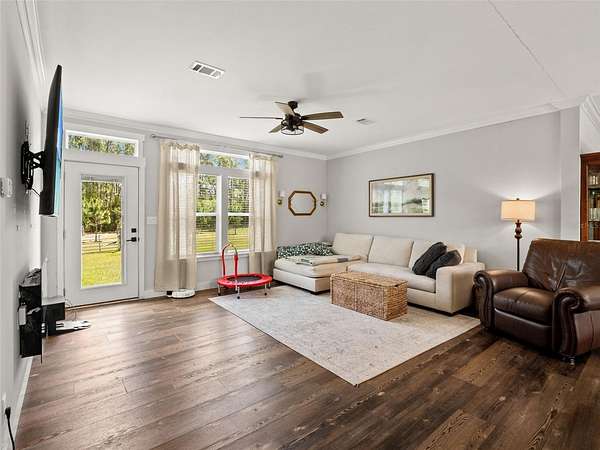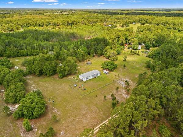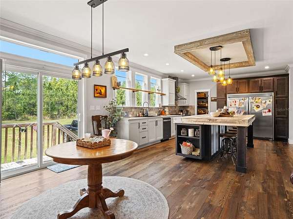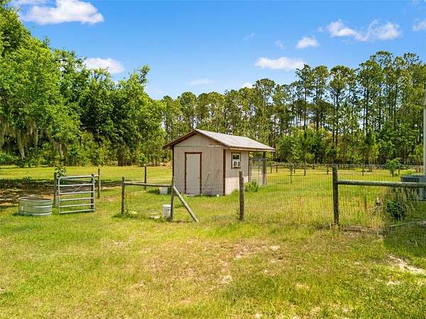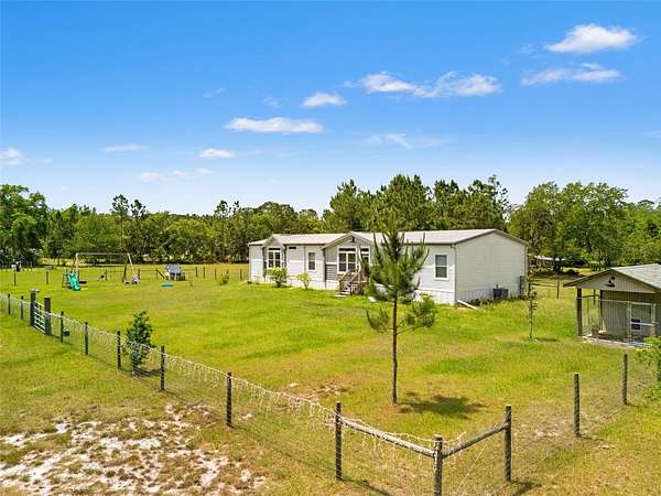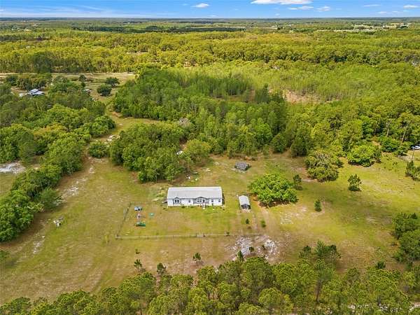 Escape to your own private 20-acre sanctuary in Groveland, where peace and modern comfort meet. This expansive property offers the ultimate Florida lifestyle, featuring a pond and sprawling, partially wooded acreage that provides a stunning backdrop for outdoor activities. The meticulously maintained residence spans over 2,200 square feet and welcomes you with a bright, open floor plan highlighted by high ceilings and stylish rustic accents.The heart of the home is a spacious living area featuring a beautiful wood-plank accent wall and an integrated electric fireplace, perfect for cozy evenings. Large windows throughout the home invite an abundance of natural light and offer serene views of the surrounding greenery. The gourmet-inspired kitchen and dining spaces flow seamlessly, anchored by a charming wooden beam and designer lighting.Retreat to the primary suite, a true oasis boasting a sophisticated board-and-batten feature wall and a spa-like ensuite bathroom. This luxury bath includes dual vanities, chic blue subway tile, and a deep freestanding soaking tub positioned against a weathered wood backdrop for a touch of rustic elegance. Two additional well-appointed bedrooms provide plenty of space for family, guests, or a home office. Outside, the property is a nature lover’s dream, complete with fenced areas for pets or gardening and a private deck ideal for morning coffee overlooking your vast estate. With no HOA restrictions and incredible privacy, this 2022-built home offers the freedom and tranquility you’ve been searching for. Come experience the beauty of 12048 Sherington Place for yourself.