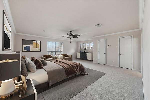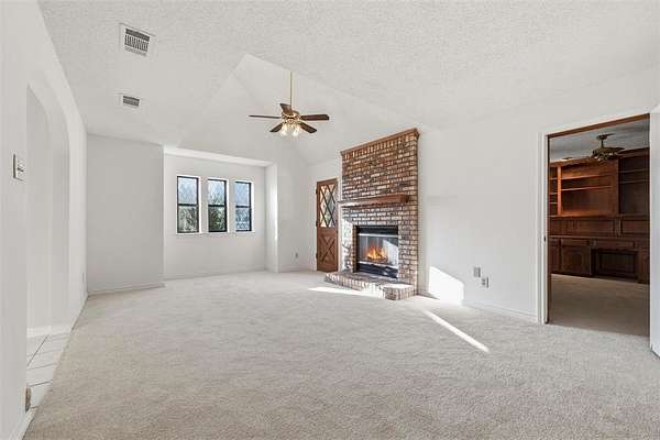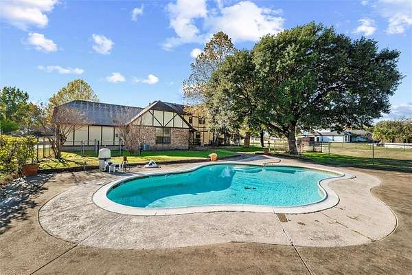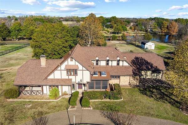 Welcome to this beautiful English Tudor home OUTSIDE the CITY LIMITS with so much character! This two-story home offers a living room with a wood burning fireplace and an office with built-ins and its own private entrance; perfect for an in-home business. The home features an eat-in kitchen, a dedicated dining room, plus a sunroom that could also be additional dining. There are TWO primary suites, both have en-suite baths. The downstairs primary could easily serve as an in-law suite, guest retreat, or multi-generational living! Outside, the property overlooks a meadow on OVER 2 ACRES plus a pond! Enjoy your own outdoor oasis with a covered back porch and a sparkling pool; perfect for cooling off on hot Texas summer days or hosting unforgettable gatherings. Brand new carpet and brand new painting throughout the home as of November 2025. Enjoy the tranquility of a quiet community paired with outstanding neighbors. Discover all this property has to offer and make it your next home!