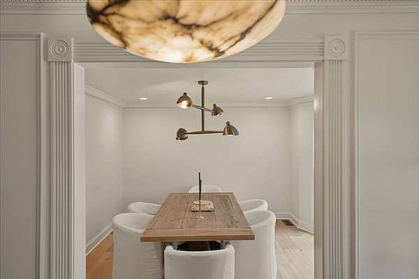 Thoughtful Details: Beverage center and wine fridge in the living room, Farrow & Ball paint, brass light switches, custom dentil and base moldings, and a vintage European back door.