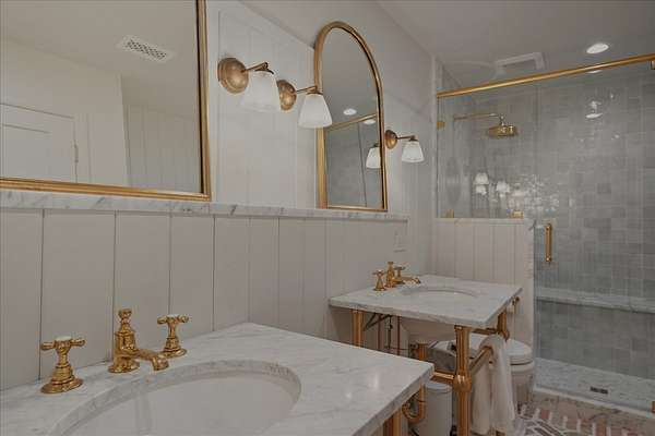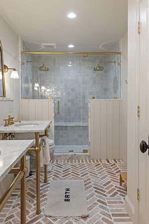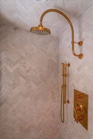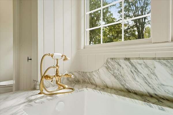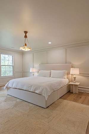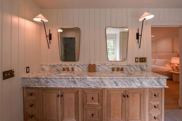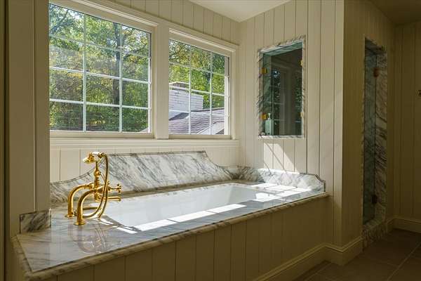 Spacious Primary Suite: Luxurious bedroom and bathroom featuring French limestone floors, marble and zellige tile shower, Mr. Steam system, Waterworks fixtures, and dual walk-in closets.