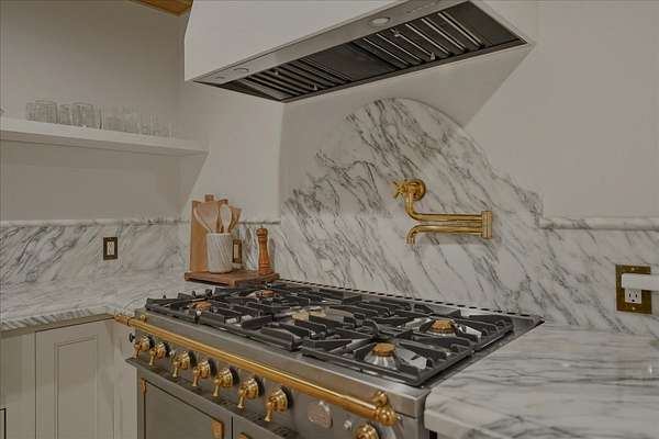 Professionally Designed Kitchen: La Cornue stove, marble fabricated sink, double ogee edge counters, custom inset cabinetry, Thermador fridge, Cove dishwasher, and white oak ceilings.