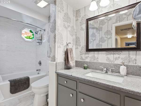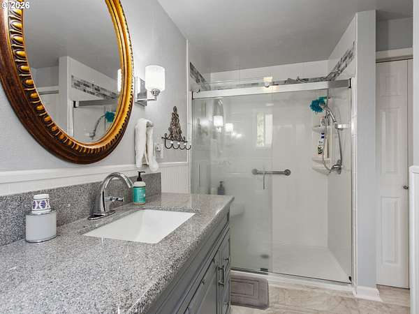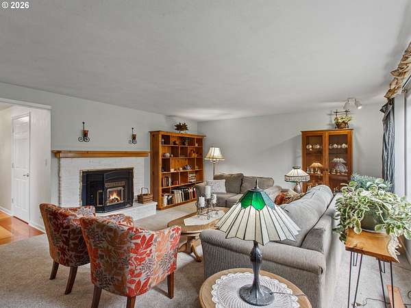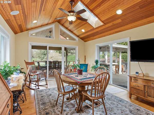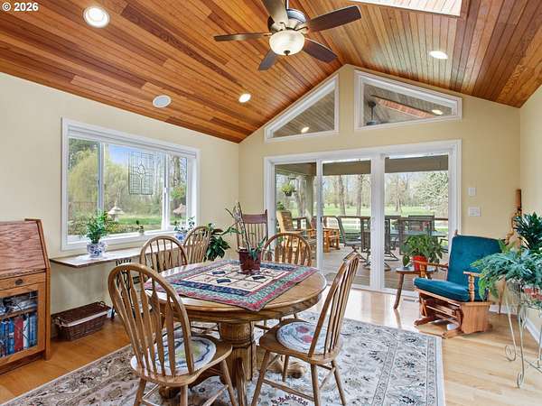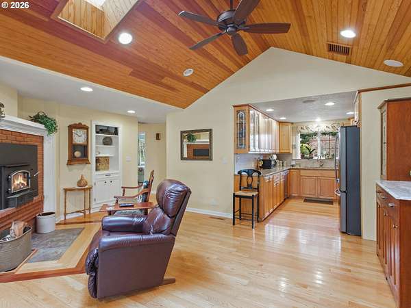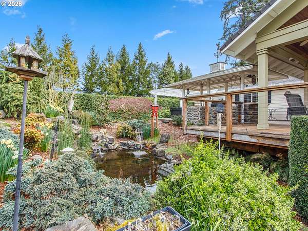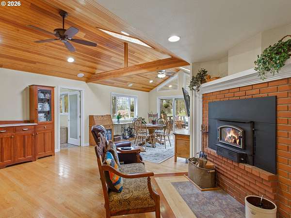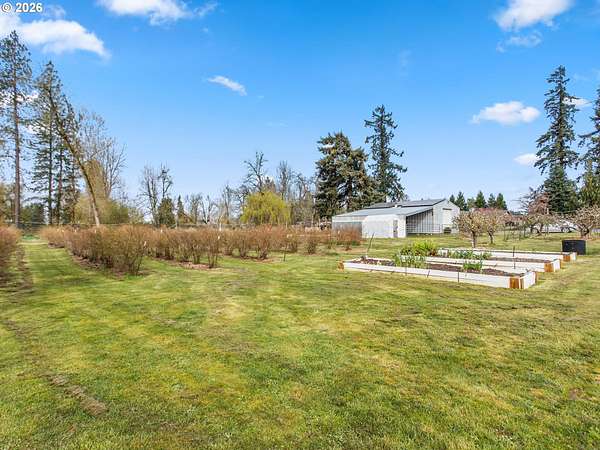 Stunningly crafted customized ranch, on Master Gardiner Designed and Landscaped Property, Overlooking Tree Lined Views and Golf Course on the 14th Tee Box! Expertly designed remodel with carefully selected finishes throughout. Enter through the front door into a light and bright oasis, featuring engineered hard wood, and front reception and living room, overlooking beautifully manicured front landscaping. Fireplace with brick finish and custom mantle, perfect for gathering, or simply enjoying nature next to a cozy fire. Updated kitchen with stainless steel appliances, solid surface granite countertops, window overlooking front views, custom cabinetry with hand crafted stained glass display panels. Kitchen connects to an open living space, with vaulted, exposed wood paneled ceilings and beams, complete with dining area and cozy sitting area with a fireplace. TV room/bonus area/game or reading room, boasts another statement feature fireplace with custom shelving, plenty of space for seating and enjoying leisurely activities. Utility room with sink, large pantry, and storage. Primary Bedroom with on suite remodeled bathroom and French doors leading to hot tub area. Outdoor area is a nature, golf lovers, landscapers dream! Designed and manicured by Master Gardiners, the yard features a full outdoor kitchen, exposed wood, vaulted ceiling covered patio, and fan with seating area, hot tub, waterfall, pond, and gardening beds, all overlooking the tree lined view of golf course! Garden includes 5 raised garden beds, 140 blueberry plants, producing 1,000 lbs per year u-pick, 9 fruit trees, asparagus, and a variety of grapes. Outbuildings galore make for a hobbyist's dream! 576 sq ft detached garage, 36x28 ft shop, complete with work benches, built ins, electricity, and wood stove for heating, 24x36ft RV shed, 16x12 ft tractor building, and 8x16 wood shed, 8x12ft greenhouse.27 solar panels 1t 327 watts, for an est.11,478 kw per year. Backup energy with gas generator.