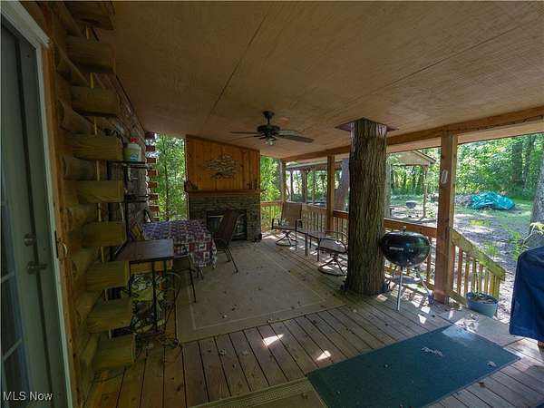 Welcome to this Charming Log Home nestled on 5 serene, wooded acres. This beautifully crafted rustic log home offers a warm, inviting atmosphere with all the modern comforts you need. The home features 3 spacious bedrooms, including a first-floor master suite, and 2 full baths plus 2 convenient half baths. You'll love the expansive cathedral ceilings and the open-concept living room, complete with a cozy fireplace-perfect for relaxing evenings or entertaining guests. The kitchen boasts ample counter space, a breakfast bar, and all appliances included, making it ideal for everyday meals and hosting. Enjoy year-round comfort in the enclosed, heated porch, or step out onto the back deck featuring a second outdoor fireplace, ideal for gathering under the stars. Upstairs, you'll find two generously sized bedrooms with an additional staircase to garage, a full bath, and an additional lofted living area that overlooks the main floor, offering flexibility as a lounge, home office, or playroom. The unfinished basement has high ceilings, ready for your finishing touches-whether it's a home gym, game room, or additional living space. Outdoors, enjoy a picnic pavilion for summer cookouts and 2 story pole barn, with two 11ft garage doors and an unfinished loft, offering excellent potential for a workshop, guest quarters, or storage. Easy access to US422 and Turnpike. Recent updates include Roof 2020, HVAC 2021, Water Treatment System 2020 and Leaffilter gutter guards 2021 with transferable warranty. This home combines peace of nature with comfortable living, Home Warranty Included!!