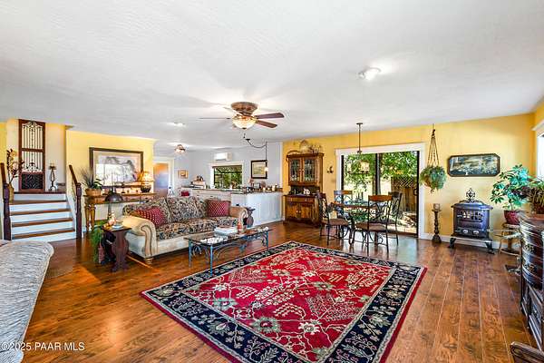Experience country living at its finest! This charming 5-bedroom, 3-bath ranch sits on 2 breathtaking acres, where a serene lily pond welcomes native birds each morning and abundant wildlife frequents the tree-lined wash that runs through the property. This home features a large open concept living room/dining/kitchen/TV room, a spacious master suite w/ a walk-in closet and en-suite bathroom, an office, laundry room and upstairs storage room. Unwind on the large, covered porch that wraps around 2 sides, where gentle breezes and scenic views surround you. Get creative in two workshops and a garden shed ready for your next project. Towering shade trees complete this peaceful retreat, your perfect escape into nature's oasis.