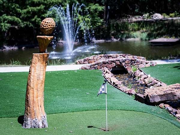 For the culinary enthusiast, two fully upgraded chef's kitchens--featuring a showstopping extended Le Chateau by La Cornue--set a new standard in sophistication. Entertain with ease in the newly recently enclosed patio with elk horn chandelier, overlooking a lagoon-style pool with cascading waterfalls, a private 9-hole putting course, carved tree stumps, lush gardens, and low-maintenance artificial turf landscaping.