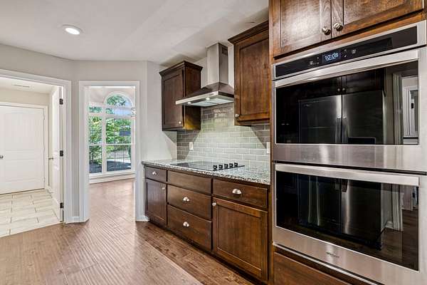 The kitchen is a dream come true, with double ovens, stainless steel appliances, and generous counter space. It connects seamlessly to a separate dining room.