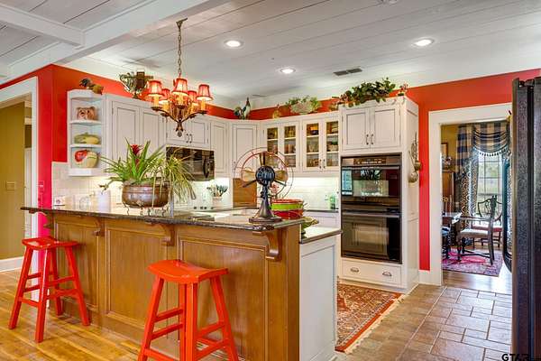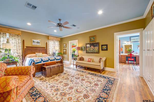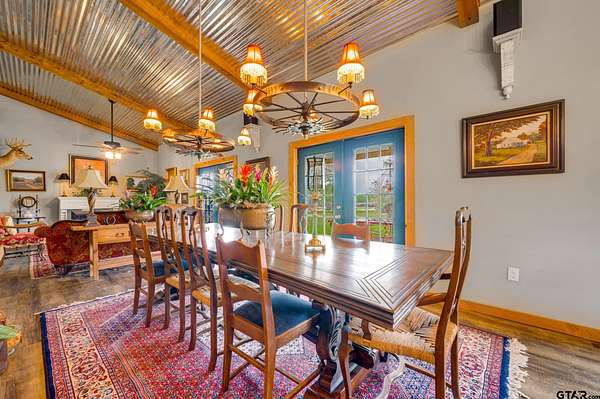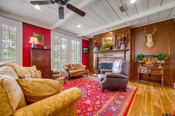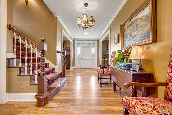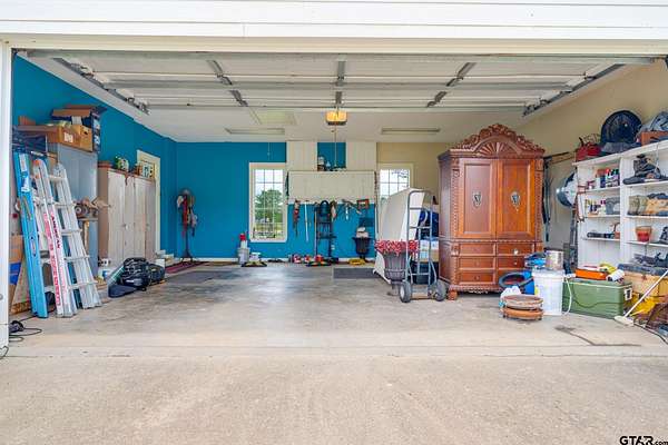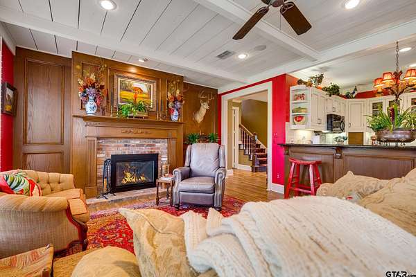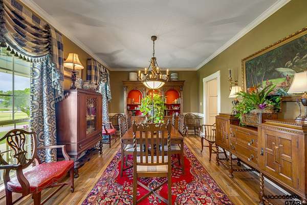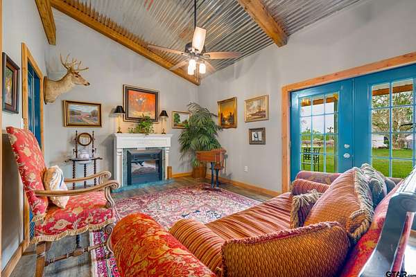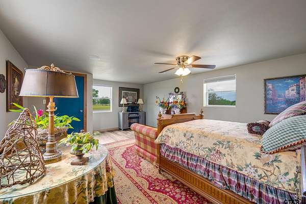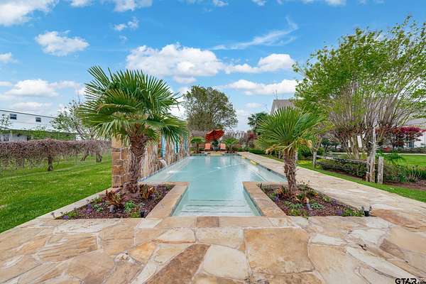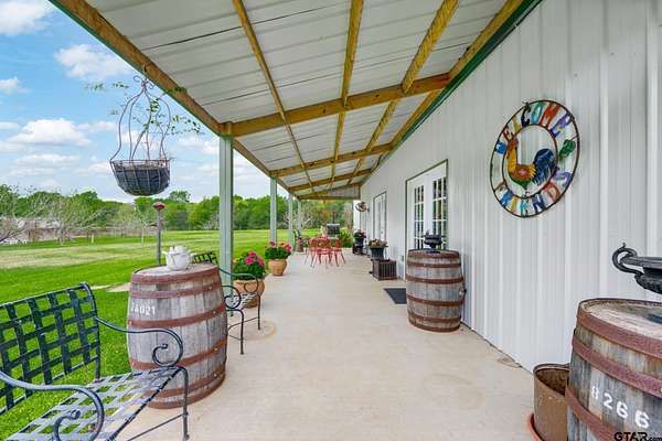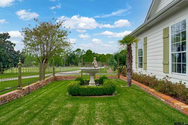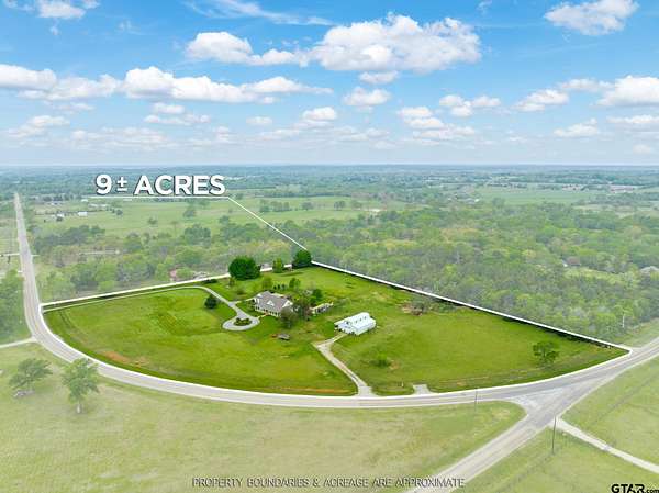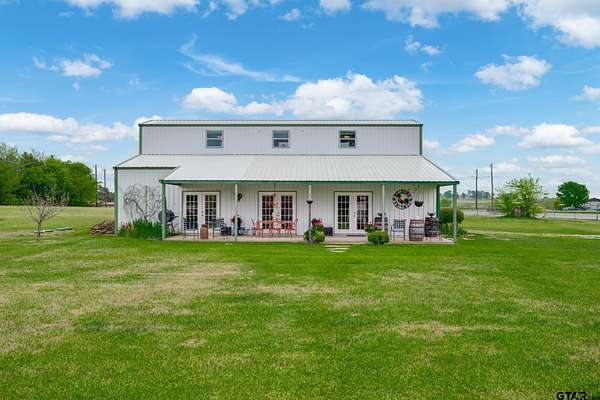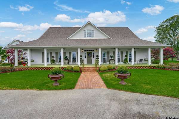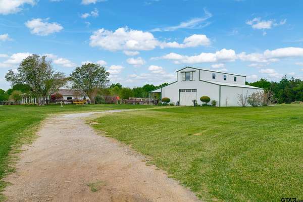Experience timeless elegance and East Texas charm on 9.301 beautifully maintained acres just minutes from Tyler. A long, scenic drive welcomes you to this classic Southern-style estate, where a circular drive and brick walkway lead to an expansive front porch—perfect for relaxing and enjoying the peaceful beauty that surrounds you. Step inside to a gracious, wide entry hall flanked by formal living and dining rooms, guiding you toward a beautiful staircase and inviting family room beyond. The 3,417 sq. ft. main residence offers a thoughtfully designed layout with 3 spacious bedrooms, including two on the main level, plus a versatile upstairs bonus room ideal as a 3rd bedroom, game room, office, or exercise space. With 3 full baths, multiple living areas, and two dining spaces, this home is perfectly suited for both everyday living and entertaining. Rich wood floors and abundant windows fill the home with natural light and bring the beauty of the outdoors inside. Step outside to discover exceptional outdoor living spaces featuring lush landscaping, flagstone accents, a sparkling pool, and a cozy outdoor fireplace—creating the perfect setting for gatherings or quiet evenings under the stars. A standout feature of this property is the impressive 3,600 sq. ft. barndominium, complete with a welcoming 500 sq. ft. covered front porch. Inside, the 1,800 sq. ft. guest quarters showcase an open-concept living, dining, and kitchen area highlighted by a striking beamed metal ceiling, along with two bedrooms and one bath upstairs. The additional 1,800 sq. ft. barn/garage space offers ample room for equipment, workshop, hobbies, or storage. Surrounded by exceptional landscaping, picturesque hay pastures and a variety of fruit trees, this property offers both beauty and functionality. Located in the highly sought-after and award-winning Bullard ISD, this exceptional estate provides the perfect blend of luxury, comfort, and country living.