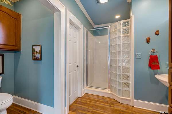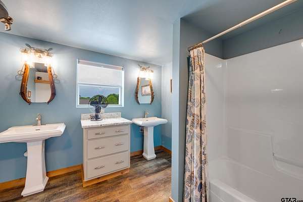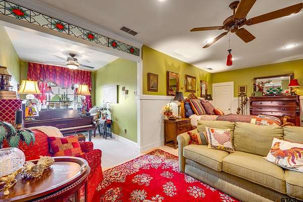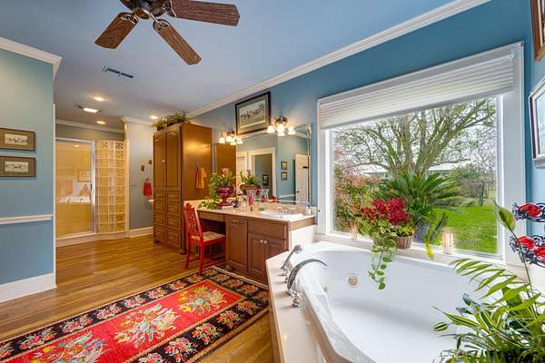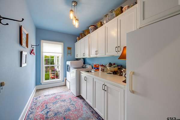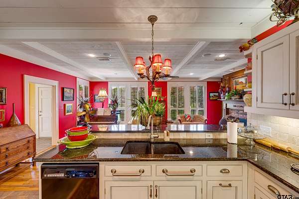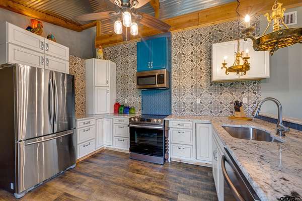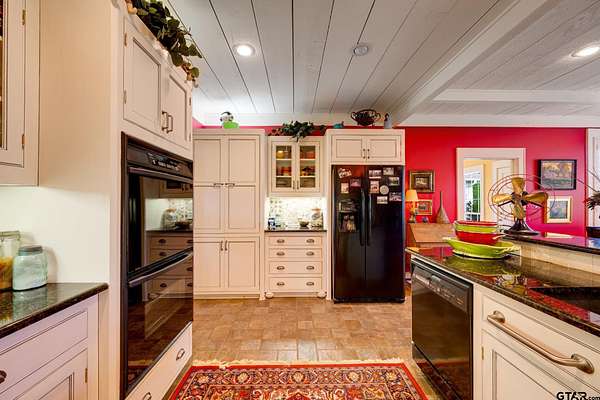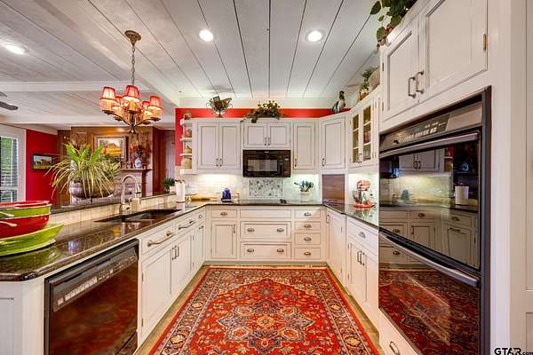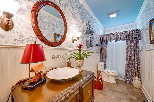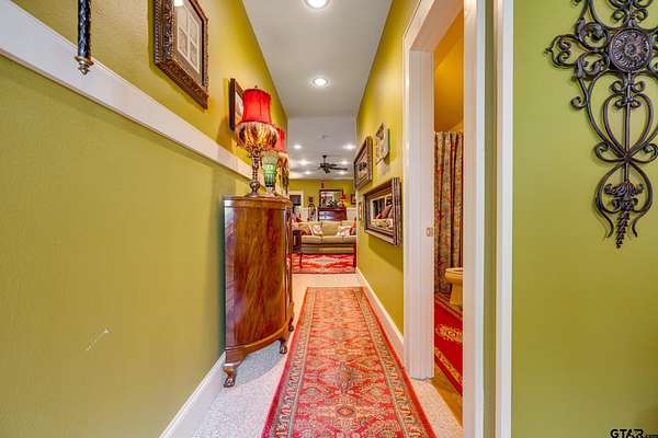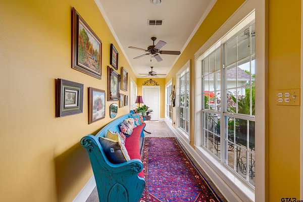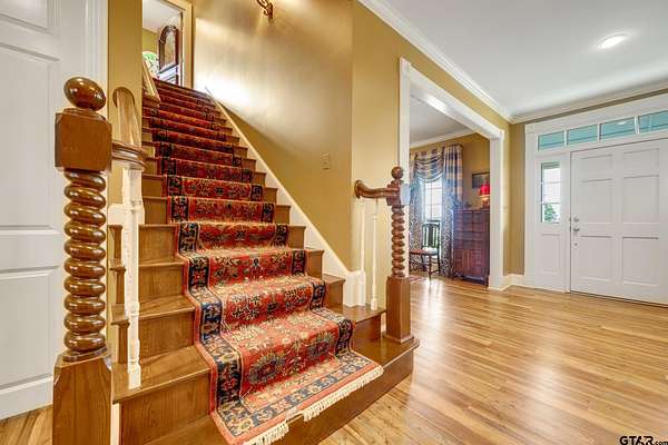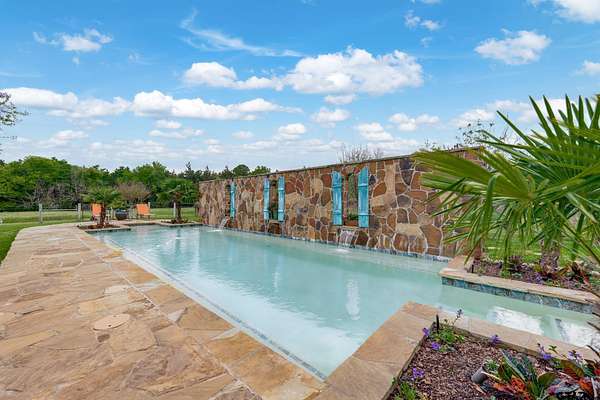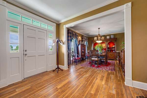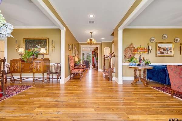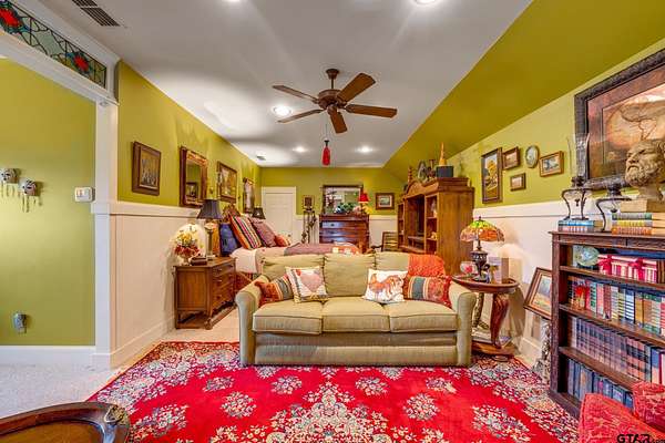 Experience timeless elegance and East Texas charm on 9.301 beautifully maintained acres just minutes from Tyler. A long, scenic drive welcomes you to this classic Southern-style estate, where a circular drive and brick walkway lead to an expansive front porch—perfect for relaxing and enjoying the peaceful beauty that surrounds you. Step inside to a gracious, wide entry hall flanked by formal living and dining rooms, guiding you toward a beautiful staircase and inviting family room beyond. The 3,417 sq. ft. main residence offers a thoughtfully designed layout with 3 spacious bedrooms, including two on the main level, plus a versatile upstairs bonus room ideal as a 3rd bedroom, game room, office, or exercise space. With 3 full baths, multiple living areas, and two dining spaces, this home is perfectly suited for both everyday living and entertaining. Rich wood floors and abundant windows fill the home with natural light and bring the beauty of the outdoors inside. Step outside to discover exceptional outdoor living spaces featuring lush landscaping, flagstone accents, a sparkling pool, and a cozy outdoor fireplace—creating the perfect setting for gatherings or quiet evenings under the stars. A standout feature of this property is the impressive 3,600 sq. ft. barndominium, complete with a welcoming 500 sq. ft. covered front porch. Inside, the 1,800 sq. ft. guest quarters showcase an open-concept living, dining, and kitchen area highlighted by a striking beamed metal ceiling, along with two bedrooms and one bath upstairs. The additional 1,800 sq. ft. barn/garage space offers ample room for equipment, workshop, hobbies, or storage. Surrounded by exceptional landscaping, picturesque hay pastures and a variety of fruit trees, this property offers both beauty and functionality. Located in the highly sought-after and award-winning Bullard ISD, this exceptional estate provides the perfect blend of luxury, comfort, and country living.