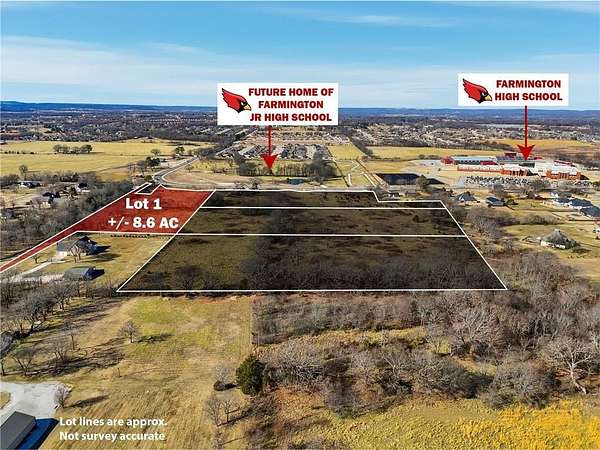 Rare opportunity to acquire prime residential development land in Farmington, AR! This ±8.6 acre corner lot is ideally located across from Farmington High School, with Hwy 170 recently expanded and the Farmington School District planning on constructing new facilities across the street. Just 2 minutes from Farmington High School and its new $16 million sports complex, this property offers exceptional visibility, access, and long-term growth potential. Zoned RE-1 (Residential Estate District), the land is well-suited for building your dream home. With NWA experiencing rapid growth and developable land in Farmington becoming increasingly scarce, this site presents a rare investment and development opportunity in a highly sought-after location. Secure your place in one of NWA's fastestgrowing markets and bring your next residential project to life on this exceptional piece of land.