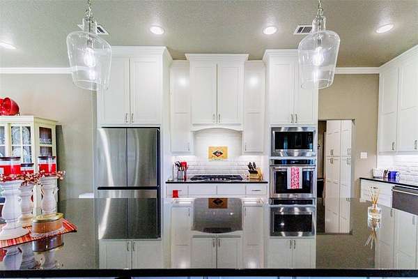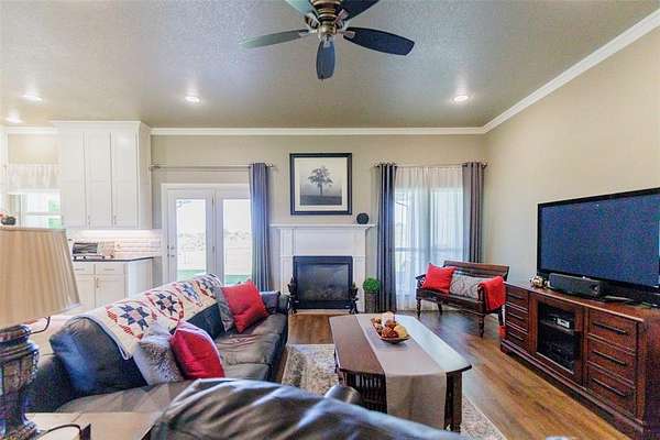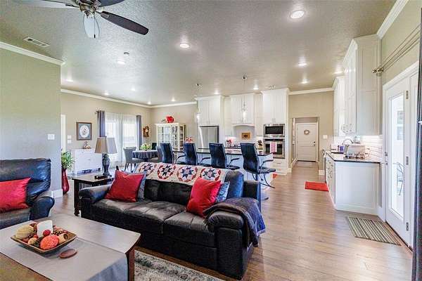 Set on just over 17 acres of agricultural exempt land, this stunning property offers the perfect blend of luxury, privacy, and country living with breathtaking views. The gated custom John Schedcik 1-story home is designed with an open floor plan, making it ideal for entertaining and family living. The chef’s kitchen features stainless steel appliances, ample storage, and a large island perfect for gathering. Wood floors extend throughout the living areas, while tile floors in the wet areas offer durability and easy maintenance.