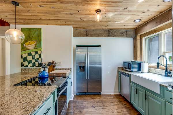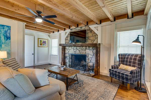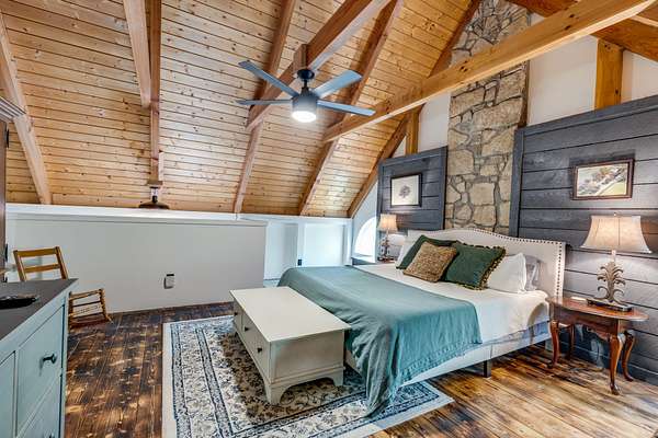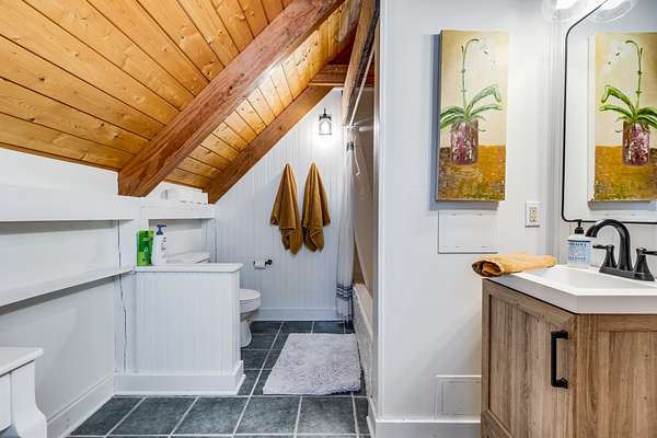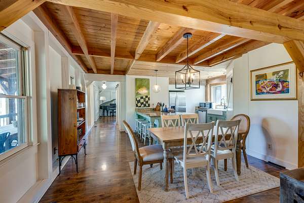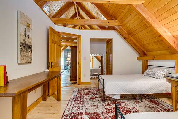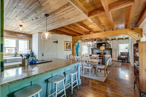 Inside, the open-concept design features tongue-and-groove ceilings with exposed beams and reclaimed maple floors, creating warmth and character throughout. Recent updates include fully renovated bathrooms, fresh interior paint, and a refreshed kitchen with new sink, cabinet hardware, and light fixtures. High-speed underground fiber internet keeps you connected while enjoying your secluded surroundings.