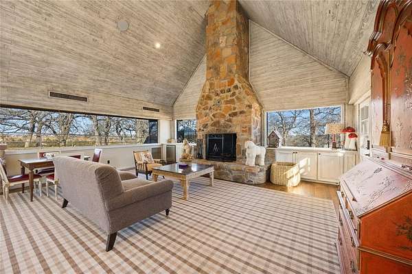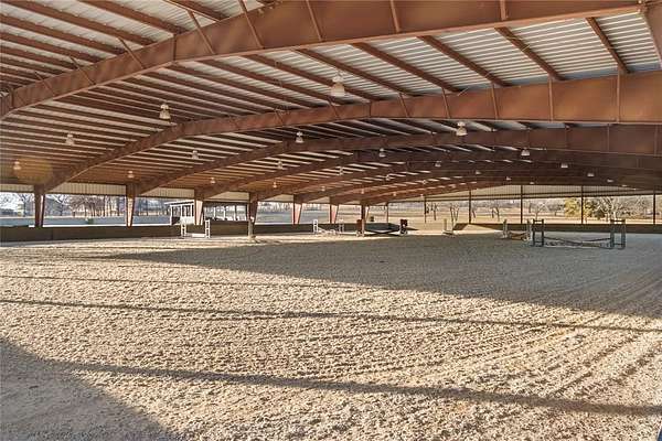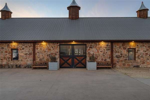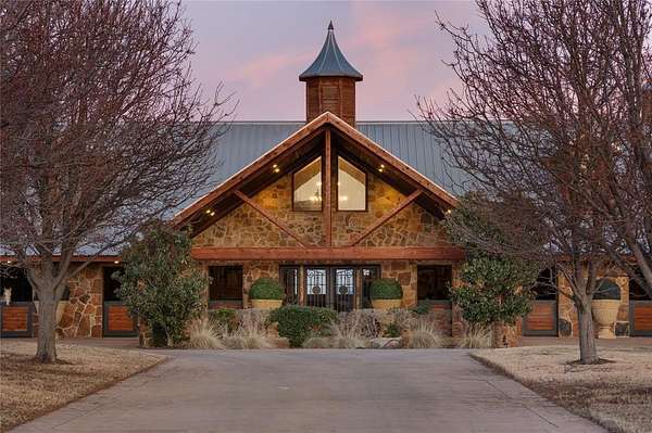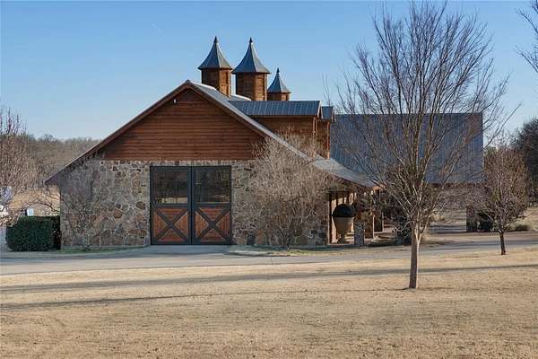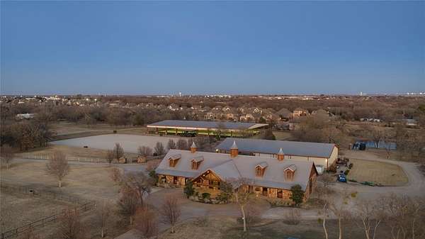 Spectacular Luxury Private Gated Retreat Minutes from the City: Authentic Farm and World Class Equestrian Estate Property on sprawling 50.28 acres (Tax) with expansive scenic views. Interiors with soaring ceilings, gourmet Kitchen with custom cabinetry and Scullery, Great Room and sophisticated Library with fireplace, entertaining rooms. Classic modern amenities throughout the home with wide wood plank flooring, luxury finishes throughout and custom designed bedroom and bathrooms with a showroom worthy walk in Primary Closet. Interiors reflect magazine quality designer luxury features. Two separate Garages with a 2 car and 3 car Garage. The grounds feature Main Horse Barn, Storage Barn with 2 separate living Quarters, Outdoor Open Horse Arena, Covered Lighted Horse Arena, Mare Barn, Covered Horse Jumping Station, Workshop, Chicken Coop, four Ponds; some stocked with Bass fish and Crappie fish for fishing. Main House includes Entry Hall with reception seating area, Library, Living Great Room with double-sided stone fireplace to Dining Room and Updated custom Kitchen with Island, open Breakfast Room seating area and Dining Area. Amenities abound with Game Room with Bar and Media Theatre and separate Guest Suites. Separate Storage Barn with Living Quarters and Laundry Room in Horse Stable Barn and Storage Barn. The Outdoors is relaxing with scenic entertaining areas with covered and open porches, outdoor Kitchen and Bar and custom designed Lamberts Pool strategically overlooking the horizon and built with multi-level water features into the property, Hot Tub and Outdoor Firepit. The right location: Equally close to Dallas as Fort Worth; approximately, under 45 minutes away. Exclusive retreat, ultra-luxurious residential amenities, state-of-the-art horse facilities and acreage.