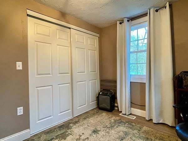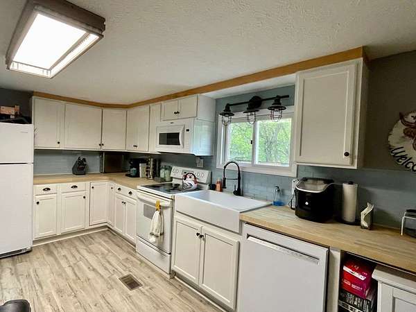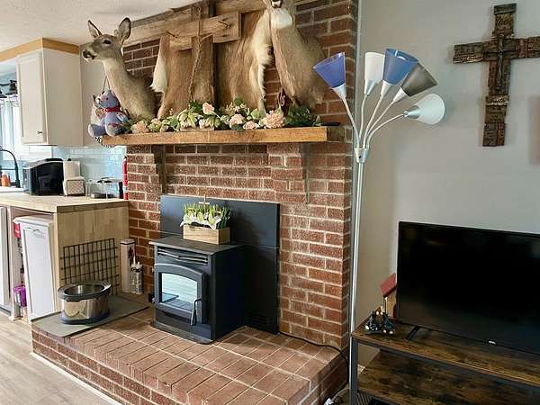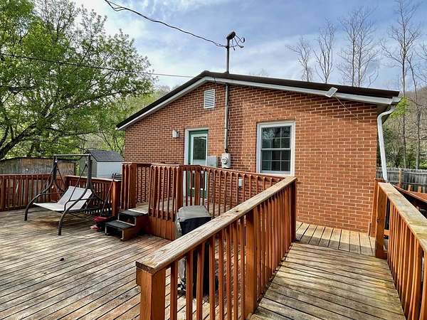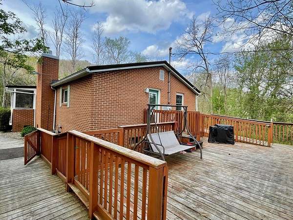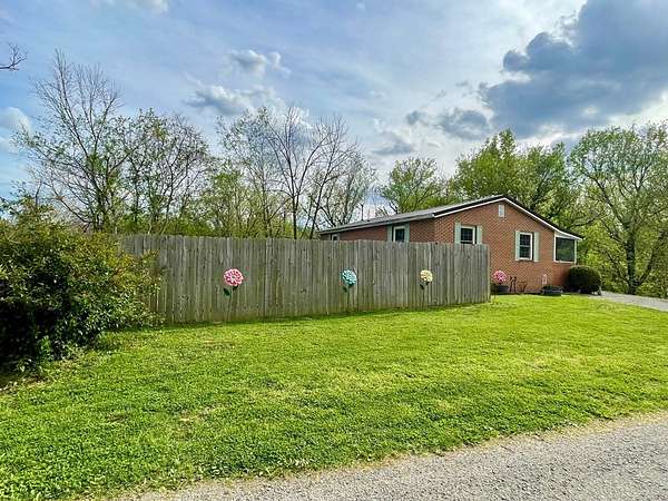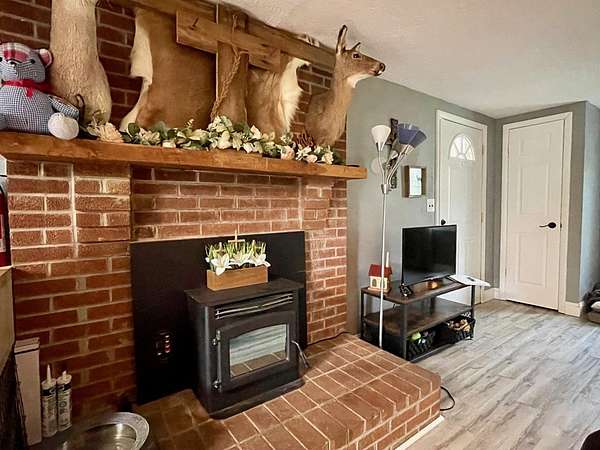 Sitting on 2 full acres that backs up to a creek, this sweet country home could be the perfect fit for you! You will immediately notice the low maintenance brick exterior with a metal roof, new windows (2023) a cozy covered front porch and large deck with ramp and privacy fenced yard. Inside offers an open plan living room with eat-in kitchen with wood pellet stove (2022). Chimney is relined and received a new crown with stove installation. Two nice size bedrooms. Newer LVT flooring throughout. Updated bathroom was renovated (2021) to include a roll-in shower for accessibility. HVAC updated in 2021 includes a heat pump and propane furnace. Unfinished basement is a walkout and includes a laundry area, a ton of additional storage or additional living space. Move in ready! A beautiful setting but you can easily jump on US35 to make travel or commuting easy.