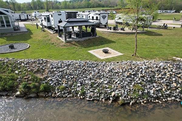 The lot features a spacious concrete pad, accommodating a variety of RV sizes and providing a solid foundation for your home on wheels. A charming gazebo and fire pit area create an inviting outdoor space, ideal for gatherings or quiet evenings under the stars. Flagstone steps lead directly to the creek, offering easy access for refreshing summer dips or trout fishing adventures.