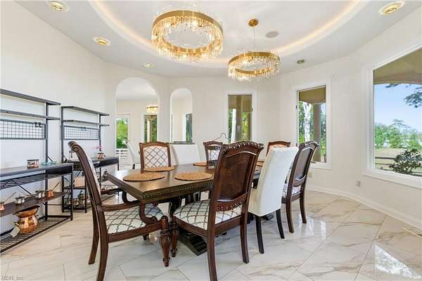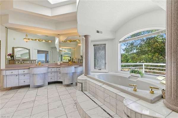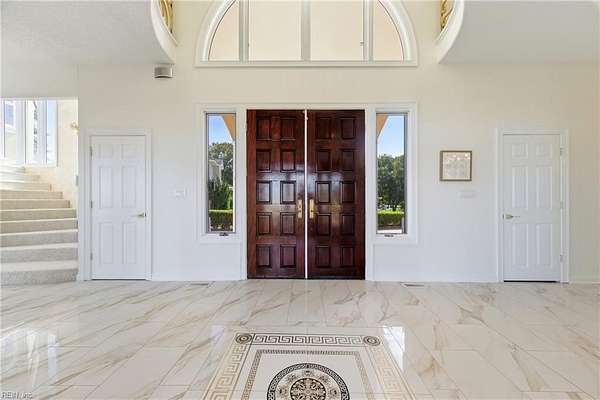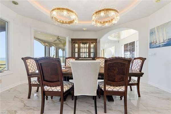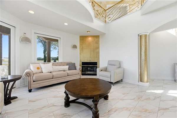 Welcome to this exquisite Spanish-style waterfront estate which offers over 6,500 sq. ft. of timeless elegance on nearly 6 acres. Completely refreshed with a clay tile roof, new plywood, fresh paint, and renewed stucco. Inside, enjoy 5 en suite bedrooms including a main-level suite with handicap access and a lavish primary retreat featuring dual toilets, soaking tub, private bar/lounge, and adjacent gym or bonus room. The grand foyer opens to soaring ceilings, porcelain tile floors, and designer lighting that flows into spacious living and dining areas. The chef's kitchen showcases custom cabinetry, Level 5 granite, premium stainless appliances, and a striking gold backsplash. Additional highlights include brand-new carpet, media room with bar and projector, two balconies with water views, 4-car garage, and full backup generator setup. Enjoy marina, clubhouse, community pool and pier. Boat slips available. No flood insurance required. Buyer incentives available with preferred lender!