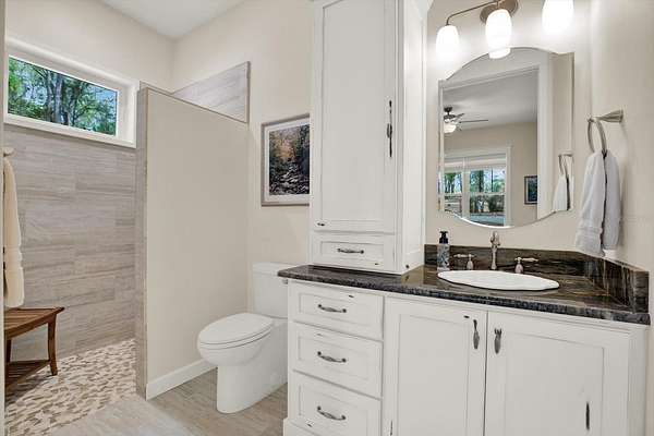 - Ceiling Fans(s), Eat-In Kitchen, High Ceilings, L Dining, Open Floorplan, Primary Bedroom Main Floor, Solid Wood Cabinets, Stone Counters, Walk-In Closet(s)