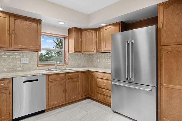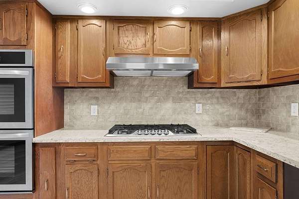 - Dishwasher, Double Oven, Gas Range, Hard Surface Counters, Microwave, Range, Refrigerator