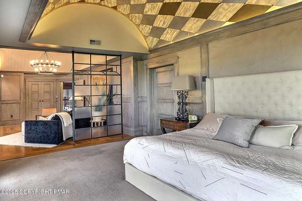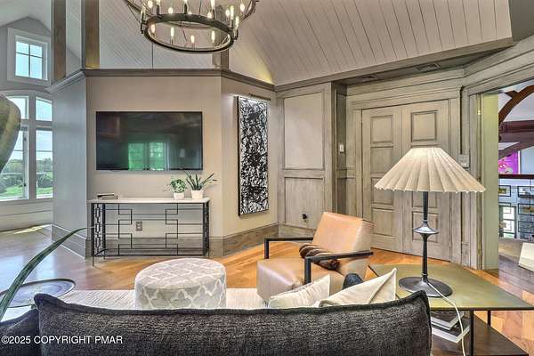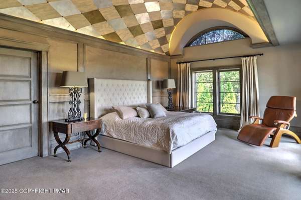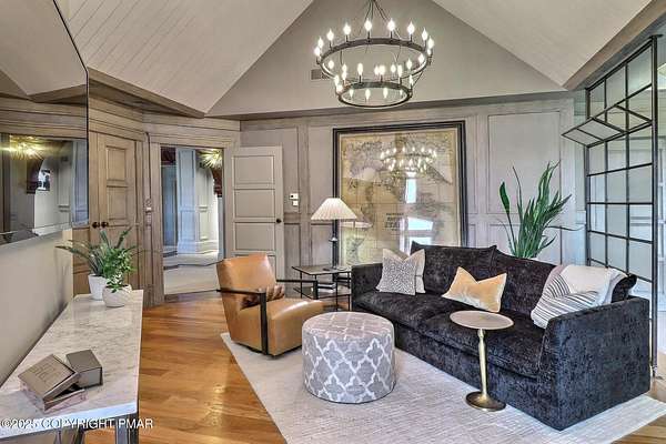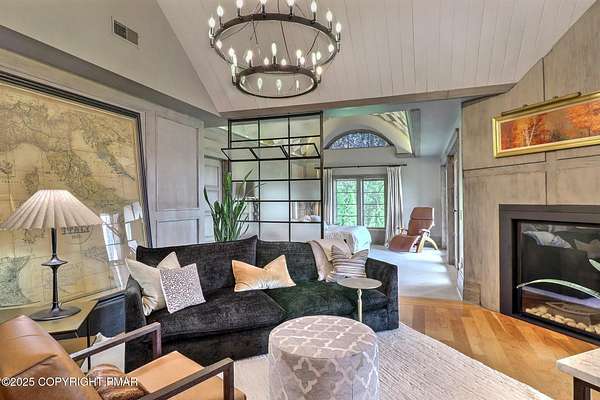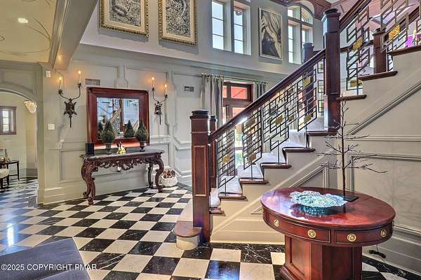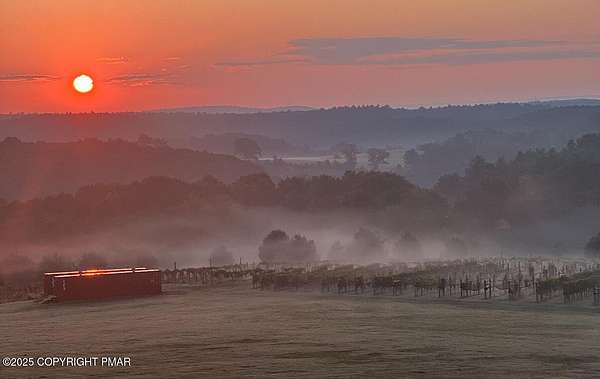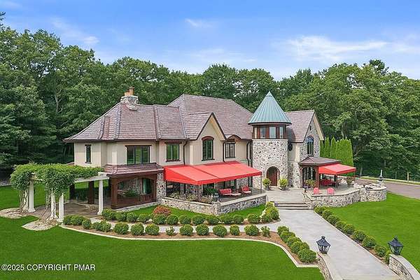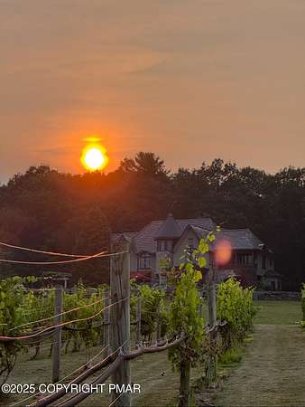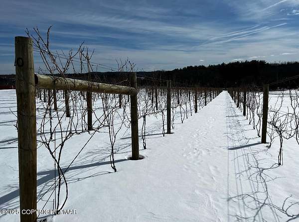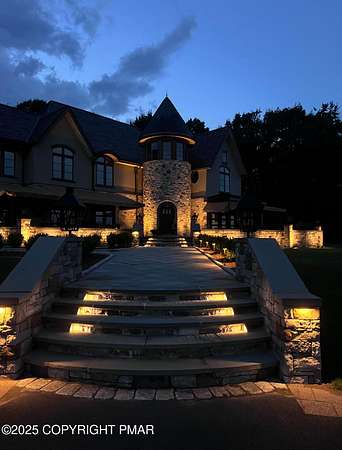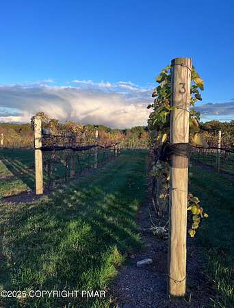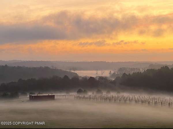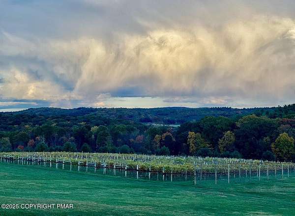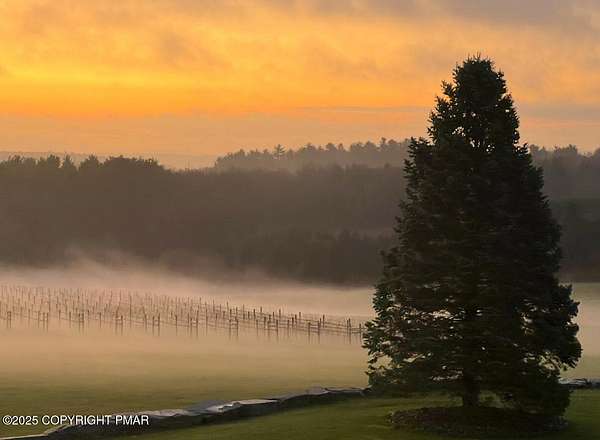 Tutto Niente - An Irreplaceable Private Estate in the Pocono Mountains! A rare 68-acre private sanctuary set amid hundreds of acres of preserved farmland in the heart of the Pocono Mountains, offering sweeping mountain views and exceptional seclusion, yet remaining within easy reach of New York City, Philadelphia, and the Northeast corridor. This four-story, approximately 8,700-square-foot architectural estate features five bedrooms and six baths and overlooks its own private vineyard with Marquette, Traminette, Aramella, and Chambourcin varietals, framed by mature trees and towering arborvitaes. A gated entrance leads to a tree-lined drive and with four garages, three climate-controlled, ideal for collectors. Inside, bespoke craftsmanship defines the home, with mahogany doors, curved walls, gold-leaf ceilings, imported granite, and art-deco detailing inspired by a classic 1920s New York hotel. Radiant floor heating throughout and commercial-grade construction ensure enduring quality. The chef's kitchen features a professional Viking range, integrated wine storage, and full bar, while the owner's suite offers vaulted ceilings, fireplace, private balcony, and a spa-like bath beneath a dramatic chandelier. A secluded guest suite and additional custom bedrooms provide privacy for family and guests. Outdoors, stone terraces, manicured lawns, open meadows, and wooded trails create a remarkable setting for entertaining, recreation, or future enhancements such as equestrian use or additional estate amenities. Also zoning potential for Potential Winery! Adding to its appeal, Pennsylvania's significantly lower cost of living, reduced property taxes, and lack of city income taxes-compared to New York and New Jersey-make Tutto Niente an especially attractive primary or secondary residence. Minutes from premier skiing, golf, lakes, resorts, and outdoor recreation, Tutto Niente is a statement estate offering privacy, architectural distinction, and refined Pocono Mountain living