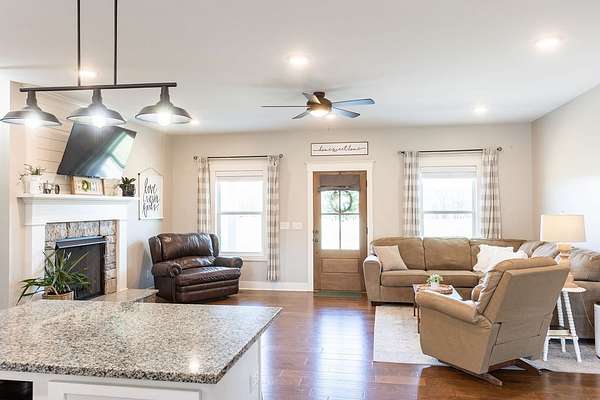 The home, built in 2020, offers 1,878 sq ft with an open concept layout, 3 bedrooms with a possible 4th bedroom, 2 full baths, and a dedicated office. Interior features include hardwood and tile flooring throughout, a spacious oversized dining room, large mud/laundry room, and a cozy fireplace. The primary suite includes a private en-suite bath.