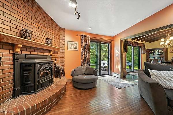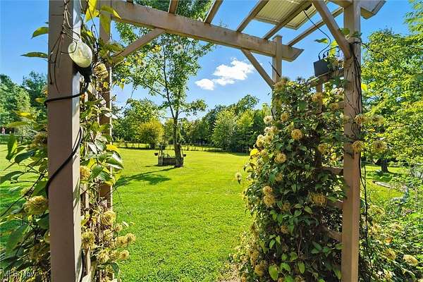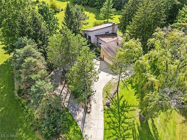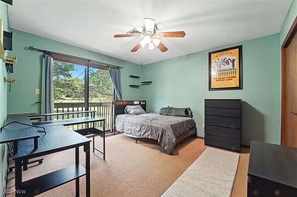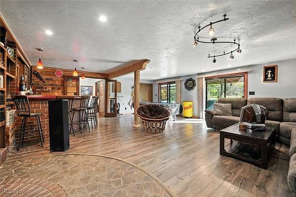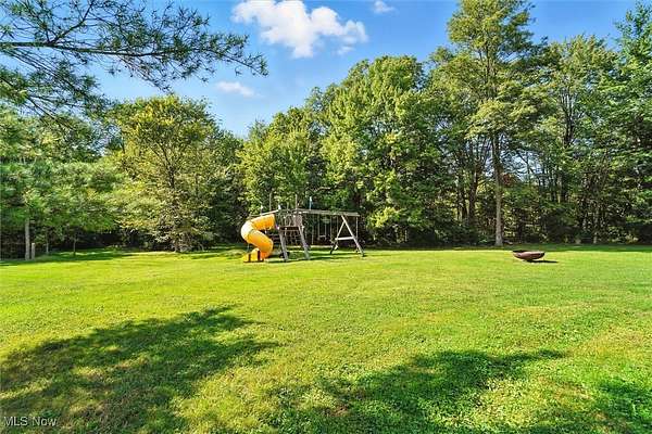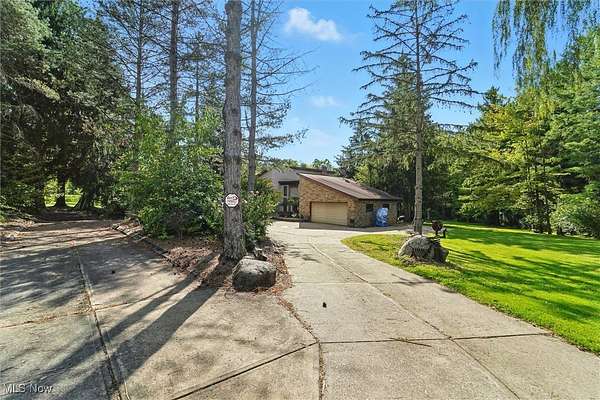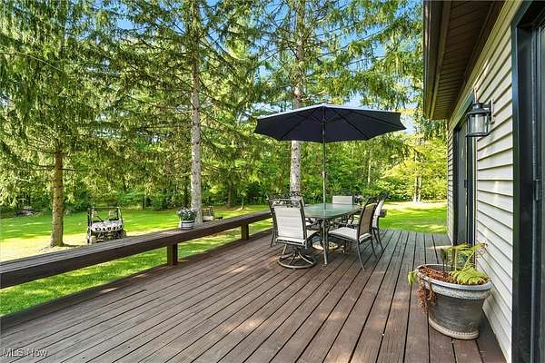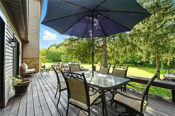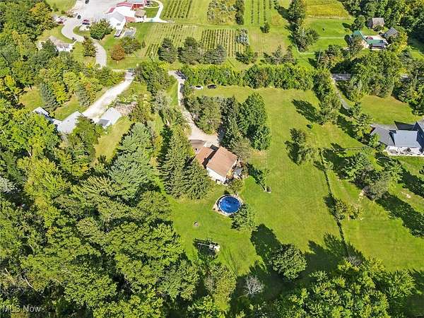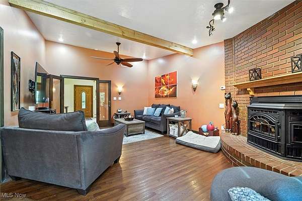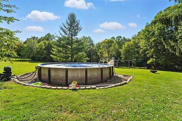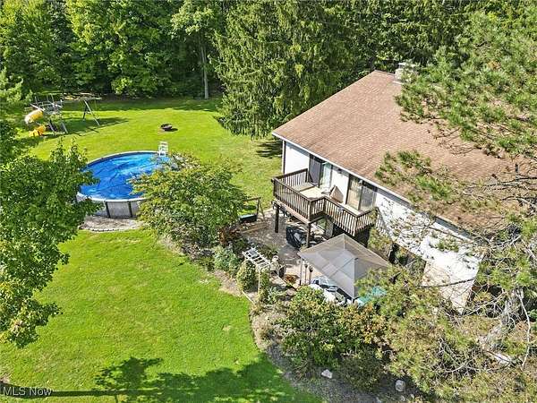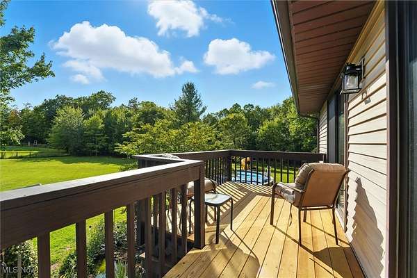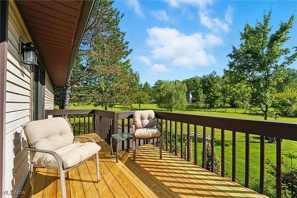Welcome to this spacious contemporary-style home situated on just over 5 acres with an ornamental pond and wonderful outdoor living spaces. Multiple bedroom decks upstairs give this property a unique "storybook" feel, while a 27' round above-ground pool adds to the fun. Inside, the home offers versatile living and entertaining areas. The living room features a beamed ceiling, pellet stove insert in the fireplace, and access to a private deck. The dining room and eat-in kitchen provide plenty of space for meals and gatherings. A main-level bedroom (currently used as a home office) includes an attached full bath and walk-out to the patio for added convenience. The family room is perfect for entertaining, with a wood-burning insert in the fireplace, wet bar, and kegerator. The lower-level basement is equipped with a home gym system the seller would like to leave for the new owner. The primary suite includes a walk-in closet and en suite bath. Additional highlights include a two-car attached garage and multiple outdoor spaces designed for relaxation and entertaining. This home truly combines comfort, function, and character-ideal for hosting family and friends in a private setting.