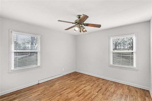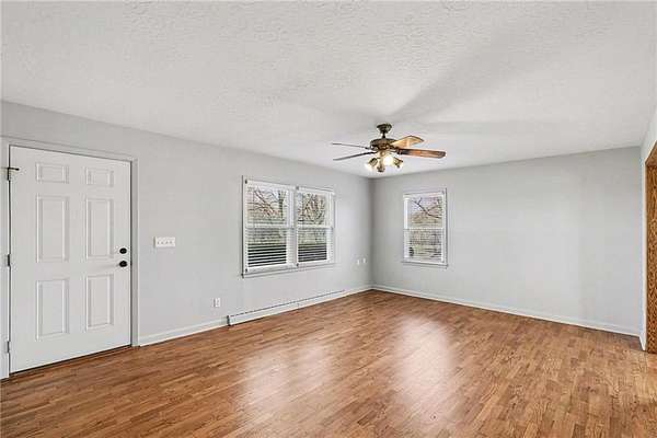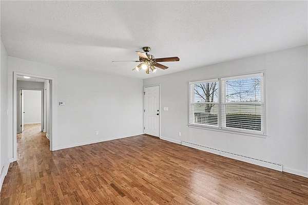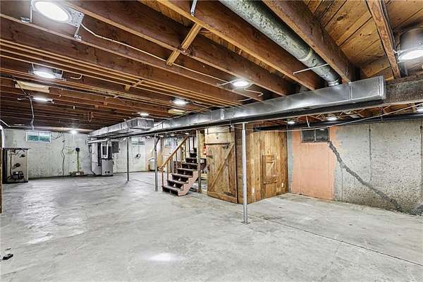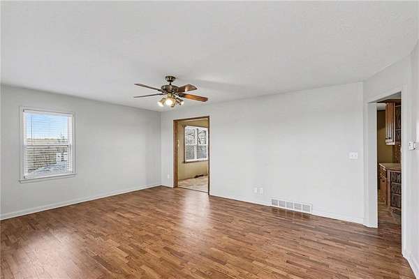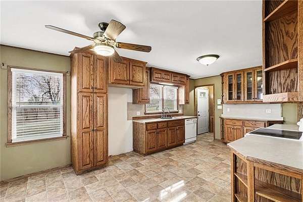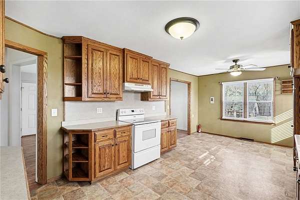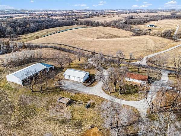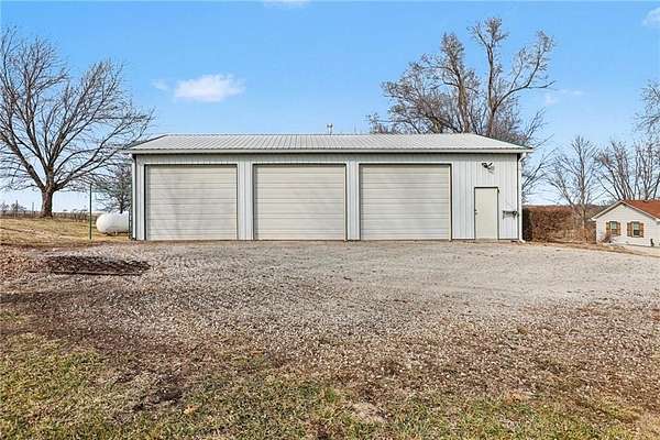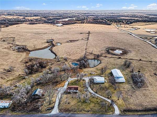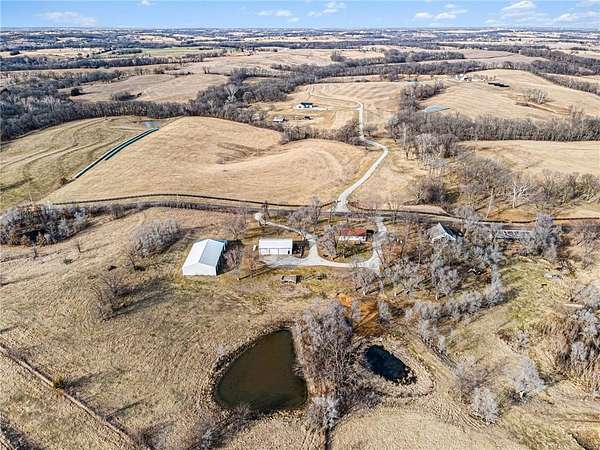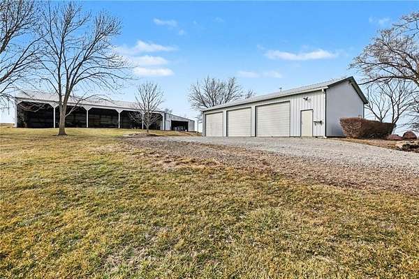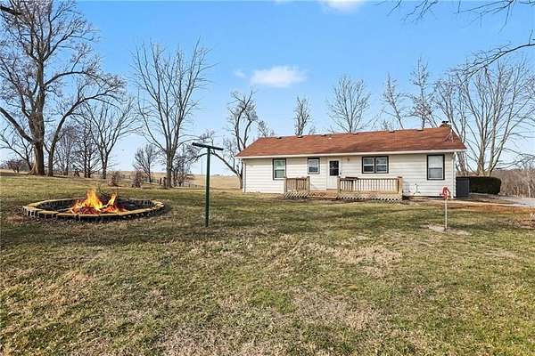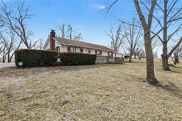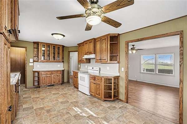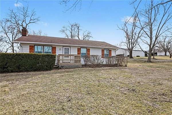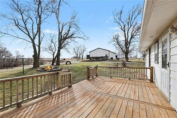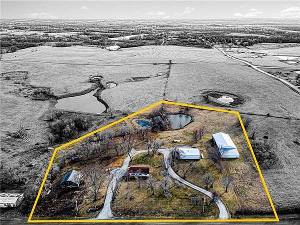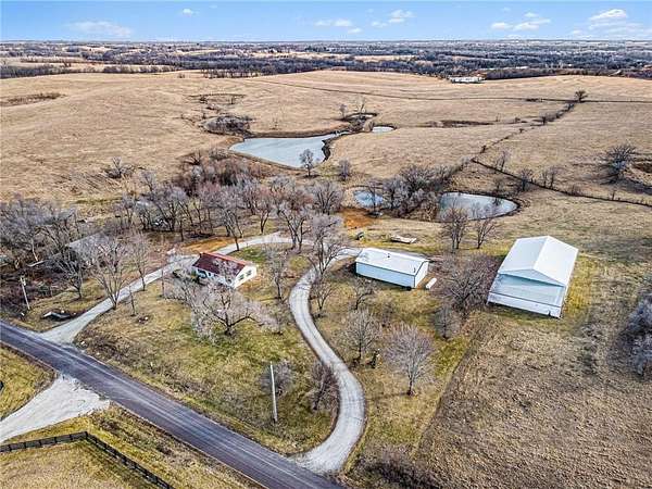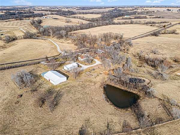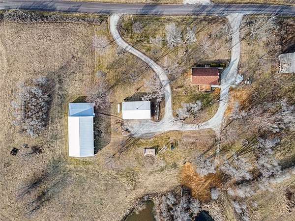 Upon entering this home, you are greeted with abundant natural light and classic wood floors that create a warm and inviting atmosphere. The kitchen and dining area flow together seamlessly, offering an open and functional layout with excellent cabinet space and charming wood cabinetry. Windows throughout the home provide plenty of natural light and a comfortable, open feel. The remainder of the home features three bedrooms, each filled with natural light, along with a full bathroom. The spacious basement provides endless potential and is ready to be transformed into whatever best suits your needs, whether additional living space, storage, or a recreation area. Situated on 5.82 acres of sprawling land, this property offers incredible outdoor amenities including a 30x50 shop with a concrete floor and electricity, as well as an additional open front storage building measuring 45x96. A nicely sized pond completes the property, adding to its peaceful and functional country setting.