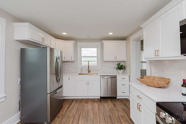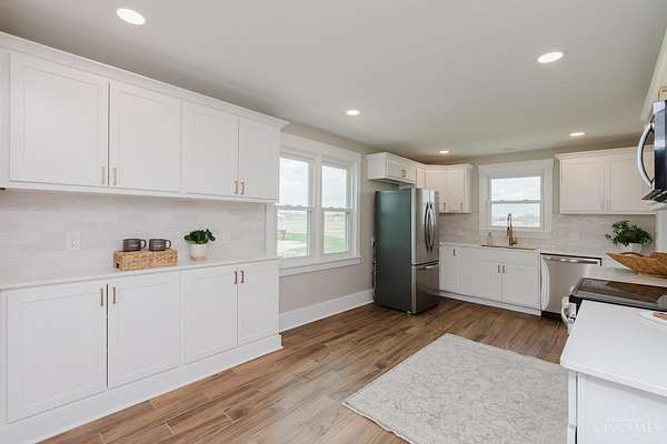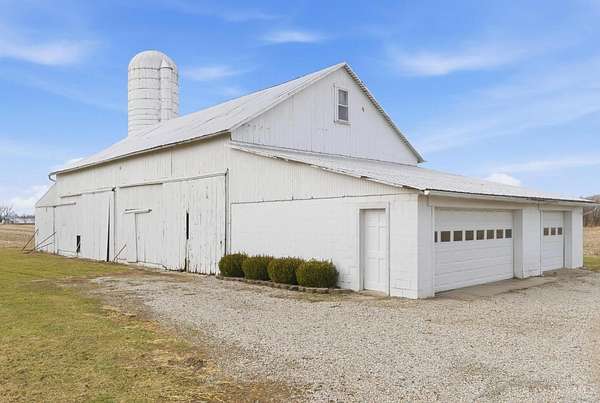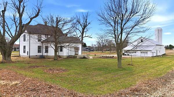 Beautifully renovated vintage farmhouse set out in the country with wide-open views for miles, yet still convenient to the interstate, offering approximately 2,100 square feet on 5 acres in the National Trail School District. A gorgeous updated wraparound porch welcomes you inside to refinished original wood floors, fresh paint, and classic farmhouse charm paired with modern updates. Two parlor rooms and a spacious dining room lead to an all-new kitchen with lovely quartz counters and wood-look tile that complements the original wood floors. A first-floor bedroom offers flexible living space, along with a full bath. Upstairs are three bedrooms with new carpet and an updated full bath. The clean, unfinished basement includes laundry, sump pump, French drain, and a new water heater, with updated electric and HVAC. Outside, an early-1900s barn with stalls connects to a three-car garage, ideal for homesteading, storage, or hobbies, in West Manchester, Ohio.