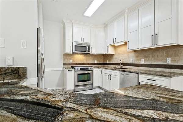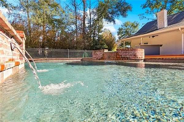 The kitchen is both stylish and functional with high-end granite countertops, stainless steel appliances, shaker cabinets, and abundant workspace for cooking and entertaining. Discover an outdoor space designed for relaxation and fun. The large composite deck overlooks a sparkling heated in-ground pool and spa framed by beautiful brickwork. A fully equipped outdoor kitchen with granite countertops, gas grill, and beverage fridge provides the perfect setting for family gatherings and weekend barbecues. The entire pool area is fenced for safety and privacy, and the surrounding lawn offers plenty of room to play, garden, or simply unwind beneath the trees.