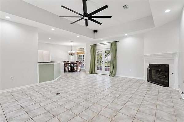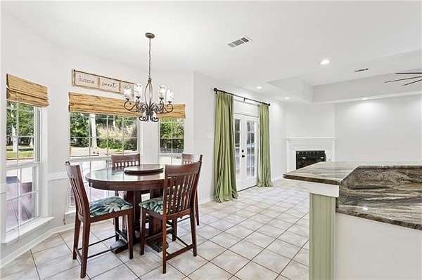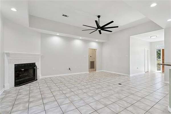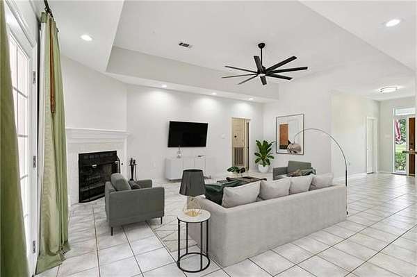 Updates include fresh interior paint, new bedroom flooring with no carpet, updated ceiling fans and LED lighting throughout, popcorn ceiling removal, a refreshed fireplace mantel, added surge protection, and new paint and tile enhancements. Located in Flood Zone X with no HOA dues, this property combines tranquility, beauty, and practicality in one stunning package.