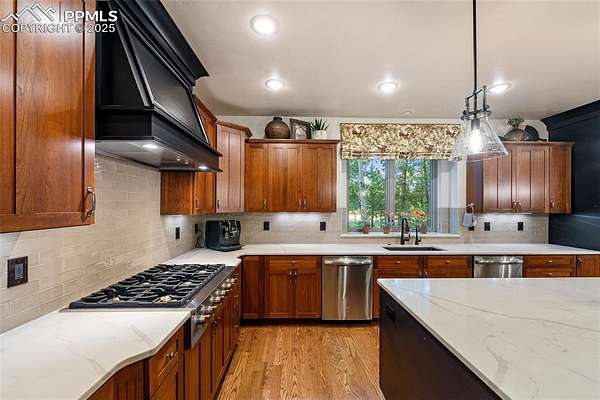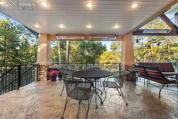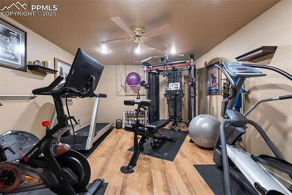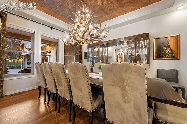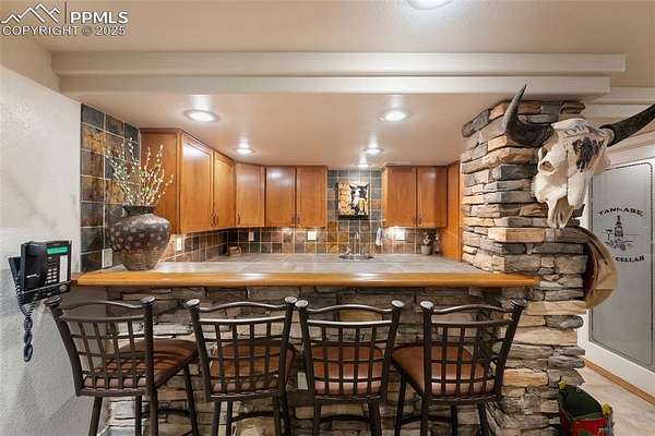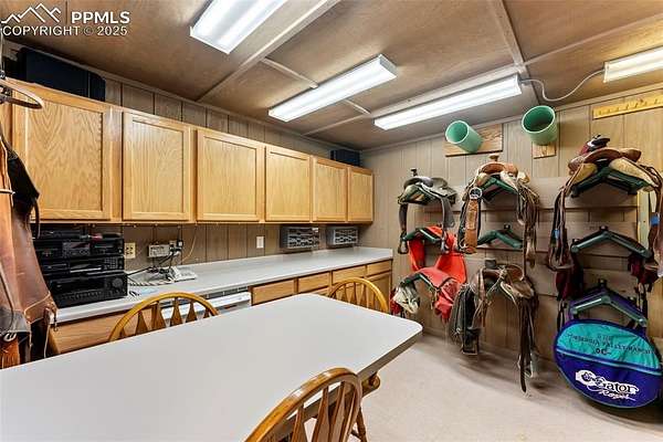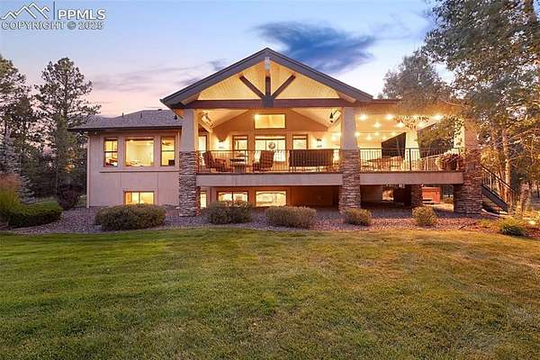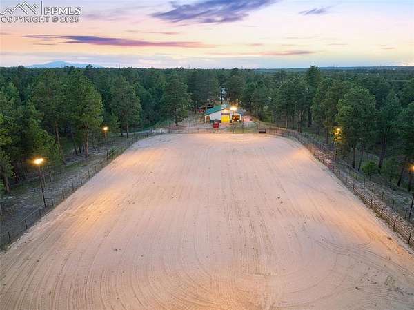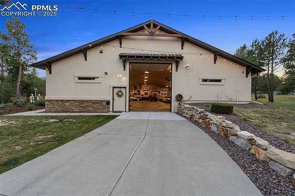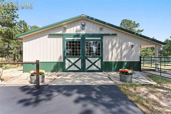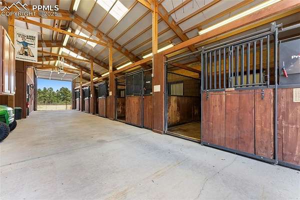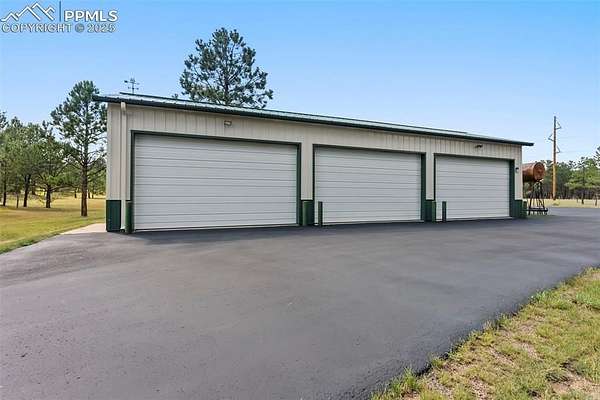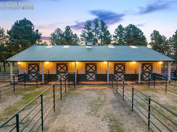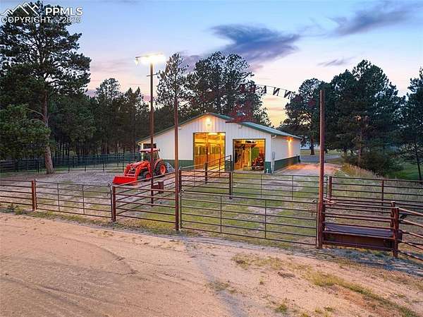 This extraordinary ranch-style estate blends Colorado luxury with amenities for car collectors, equestrians, and entertainers. The great room features soaring vaulted ceilings and a striking stone fireplace, while the formal dining room glows under a deer antler chandelier. The gourmet kitchen boasts a stone island and countertops plus stainless steel appliances. The study is complete with custom built-ins. The main-level primary suite offers a walk-in shower and walk-in closet. The fully finished basement impresses with a home theater, wet bar, wine cellar, built-in safe, and bedroom with steam shower. Dual HVAC systems, dual water heaters, and laundries on both levels ensure comfort and convenience. The property's 58' x 80' Car Bar is a showstopper, finished with special flooring, LED lighting, multiple gas heaters, and a RV-sized overhead door. Inside, a wet bar with stainless steel refrigerator and dishwasher, a heated storage room, and a 3/4 bathroom make it a fully functional entertaining space. The covered patio features radiant heaters and a gas fireplace. The Car Bar can showcase an impressive vehicle collection, host large events, or even convert into a sports or pickleball court. Equestrians will appreciate the 36' x 60' Morton barn with five Priefert stalls with automatic waterers, a heated tack room with half bath, and a spacious hay storage area. The rear-opening garage with overhead door accommodates tractor storage, while the 160' x 275' lighted arena is equipped with a roping chute and cattle pens. This setup provides everything needed for both casual riding and professional-level equestrian activities. Additional outbuildings include a 36' x 30' shop with tall overhead door, built-in benches, cabinets, shelving, a wall-mounted gas heater, and a 2-post car lift. There is also a 24' x 62' Morton equipment building with three large overhead doors. This is more than a home; it's a private Colorado compound ready to support your passions and lifestyle.